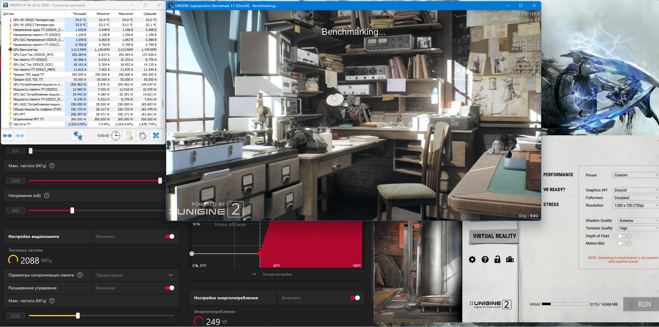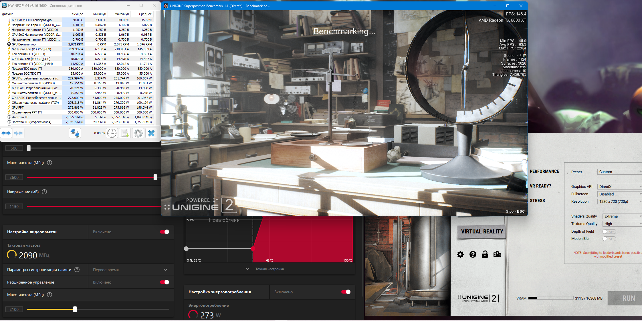 elthebest Вижу, что изменения есть, но разбираться в этом компоте неохота. Сделай по человечески: 1) перед тем как стартануть бенчмарк, обязательно кликай часы на панели HWInfo для сброса сенсоров. 2) не нужно восемь секций прогонять, достаточно 3-х, как на скринах, это ровно по минуте на прогон 2) не забывай нажимать Apply в адреналине после настройки - на твоем втором скрине телеметрия не соответствует тому, что выставлено в адреналине 3) должно получиться ДВА скрина, один с 1150mv (не нужно полностью всё в сток сбрасывать), второй с 1050mv: