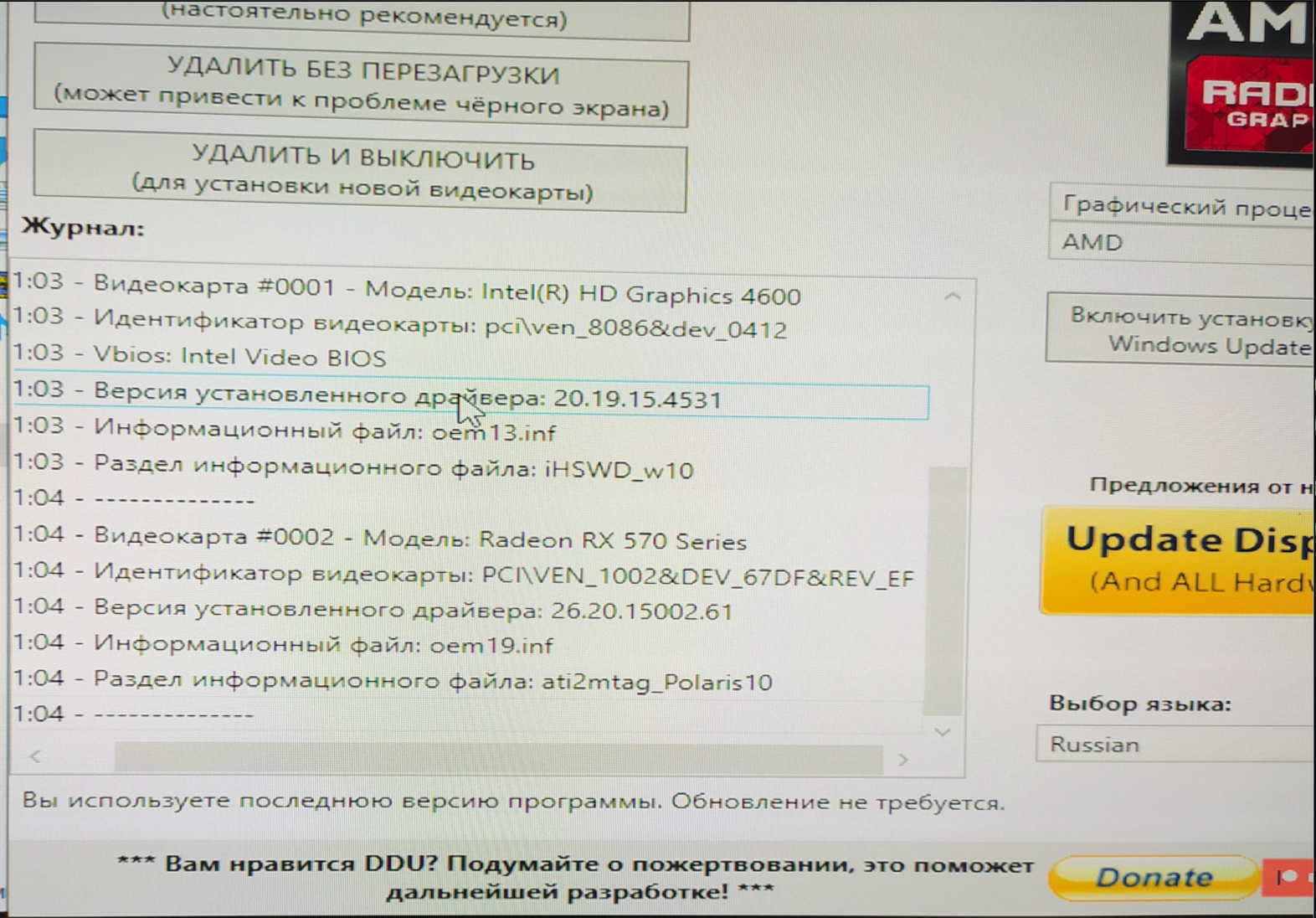 Из скрина об удалении дров ничего не подчерпнул. Тупо логи удаления всех видеодров, сначала от встройки. потом от АМД. Модель определяется как 570, так как БИОС вроде бы зашит и инфу он видит
