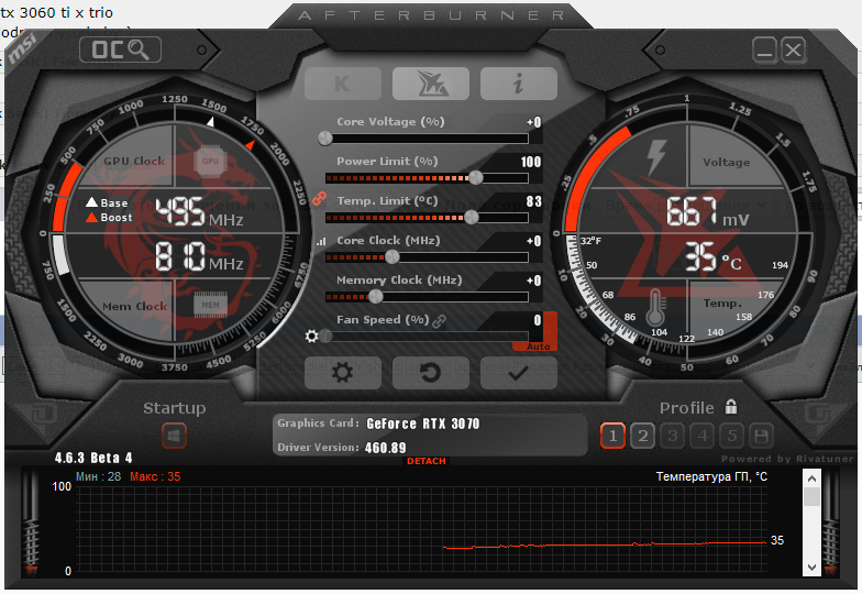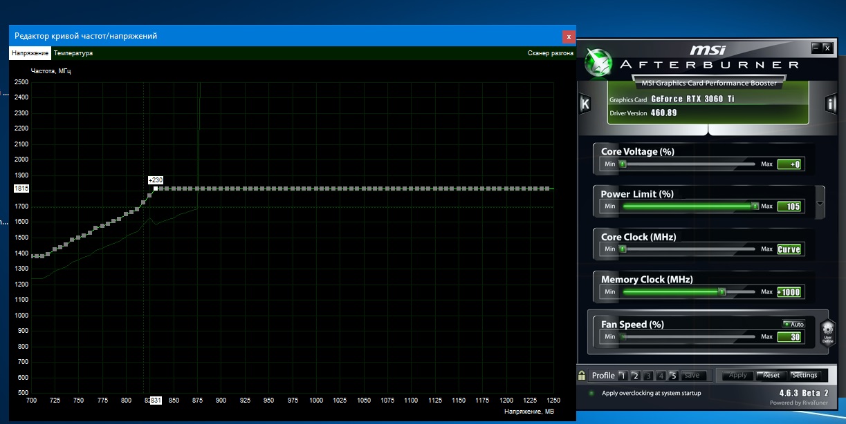 Настроил свою карту - palit dual 3060ti OC. В итоге скинул 10 градусов. Киберпанк - 68 градусов, NFS - так же. В контре 55 ))) На NFS проверял сколько потерял в fps - ничего не потерял, при этом fps стал стабильней, скачет меньше и в меньшем диапазоне Проверка стабильности дает 100% Возможно можно еще напряжение понизить, я не пробовал Если кому интересно, прикладываю скрин настроек.