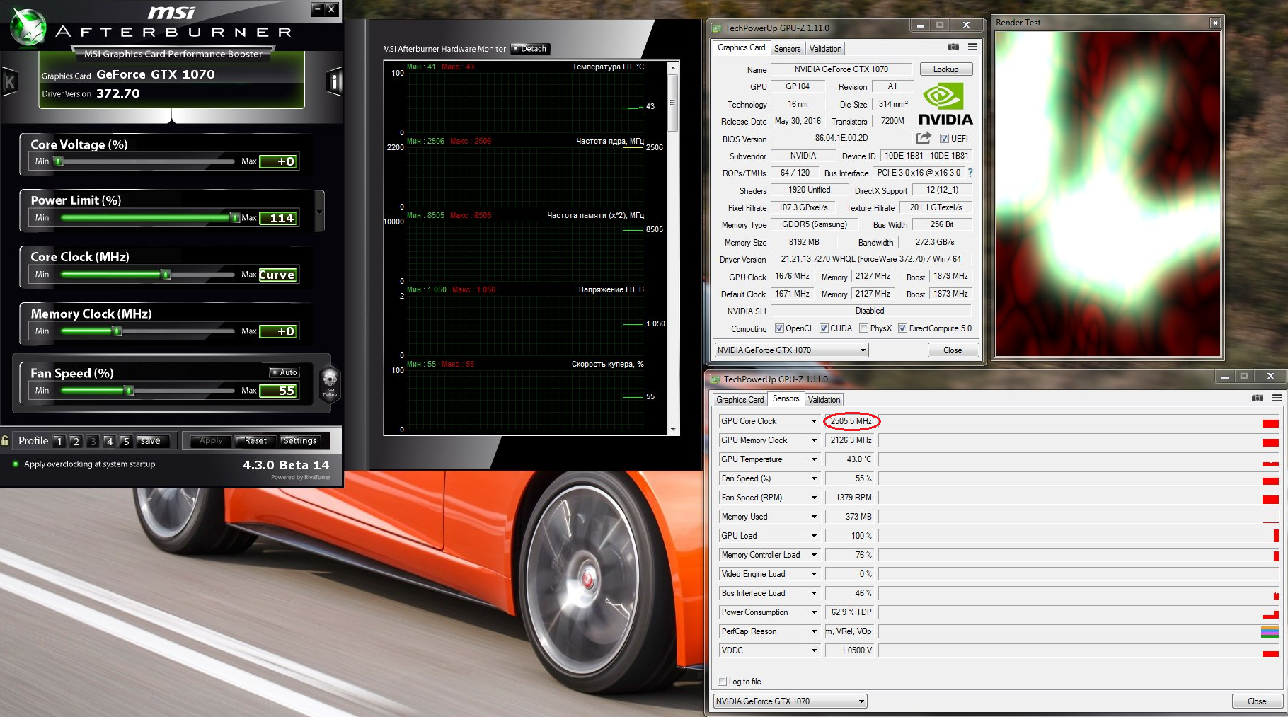 Тоже слабо верится, у меня достаточно удачный экземпляр 1070 - и то он на такое не способен . Ползунками на стоковом вольтаже до скольки гонится?