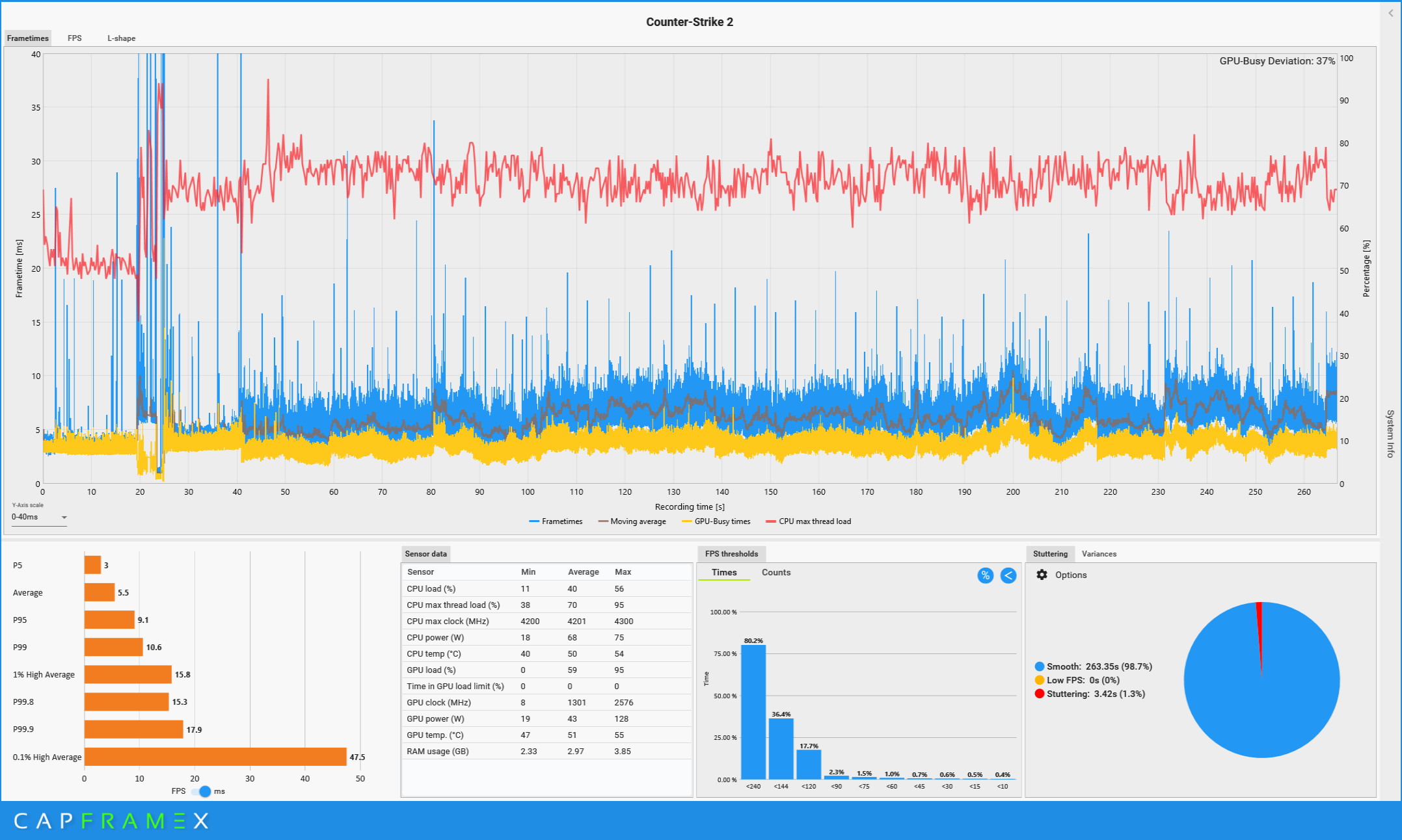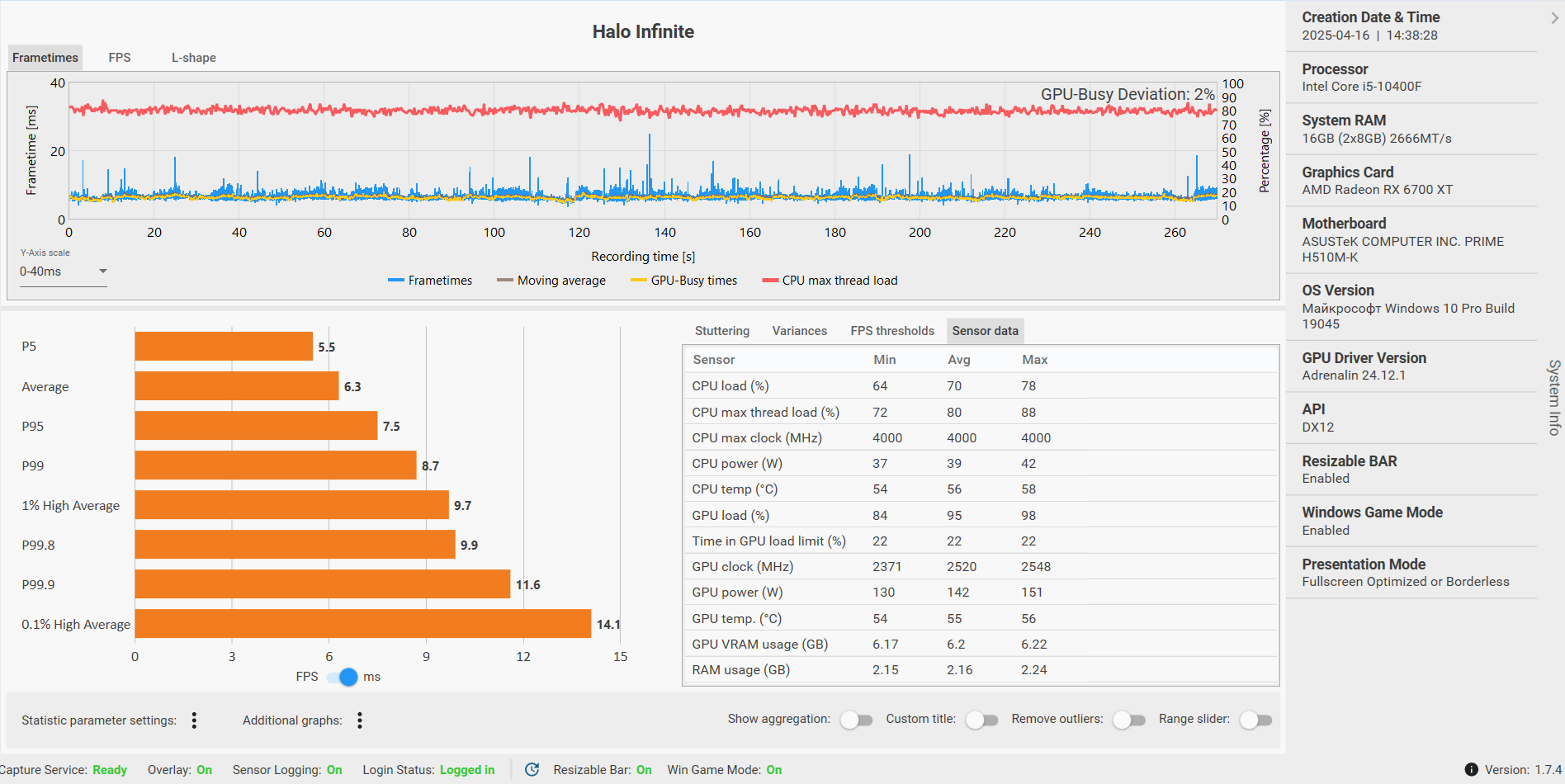 Djleks на вашем месте я бы начал с проверки всей системы в синтетике, на ошибки и соответствие эталону. В играх при мониторинге capframex ориентируйтесь на gpu-busy deviation, чем ниже значение тем меньше гпу простаивает в ожидании данных, а это может быть как проц так и память. На вашей 4,5м стате всего пару фризов, которые портят остальную относительно стабильную картину, и беря во внимание что это онлайн игра, не исключате влияние инет лагов. Если у вас в офлайне gpu-busy deviation близок к нулю (uncapped frames), то связка цпу/гпу работают норм, сбалансированно и без фризов. CS2 у меня нет, но вот Halo Infinite, кампания :