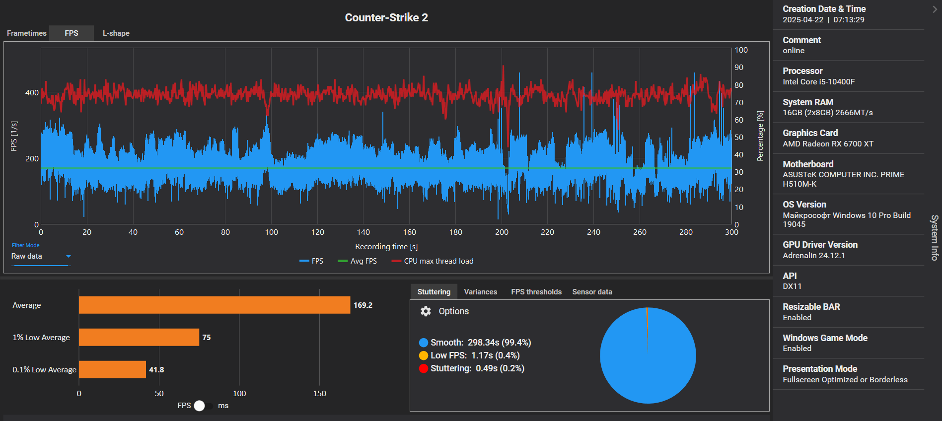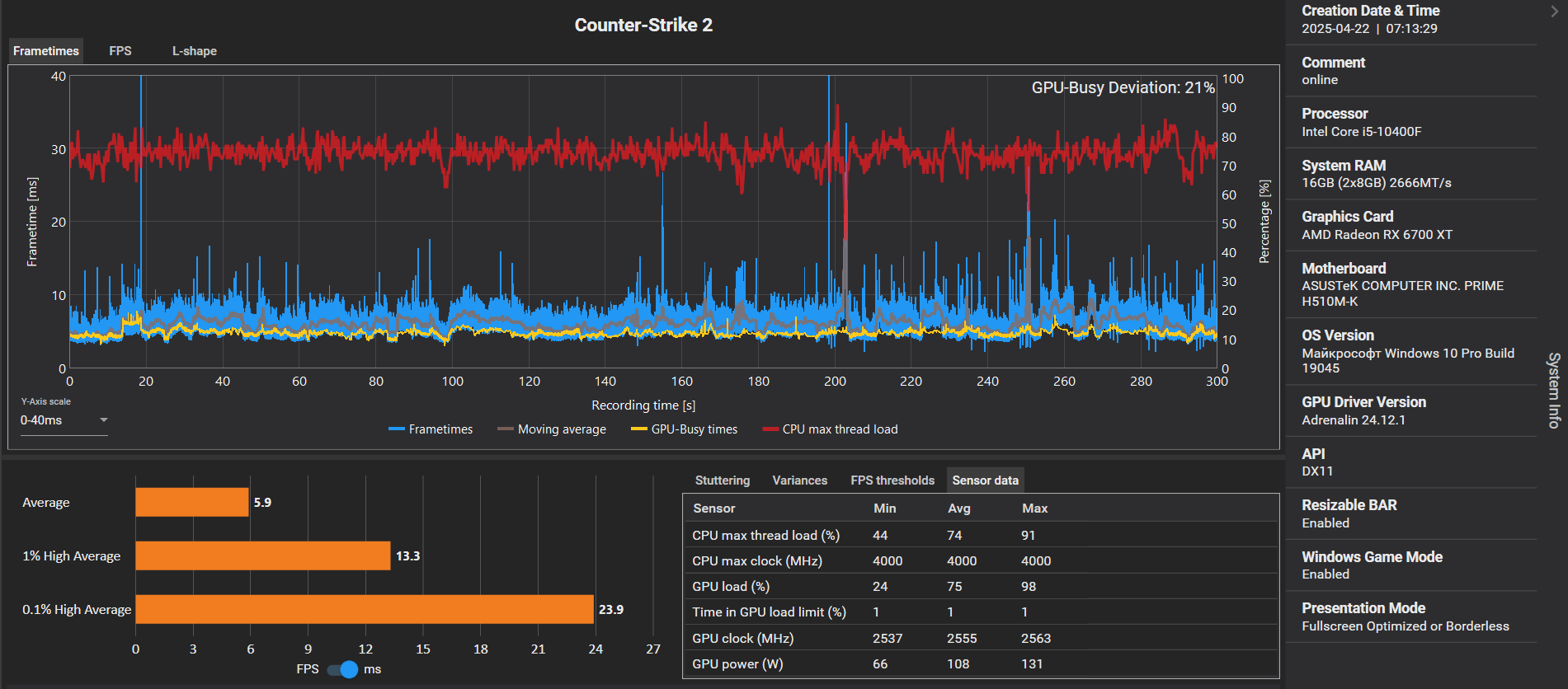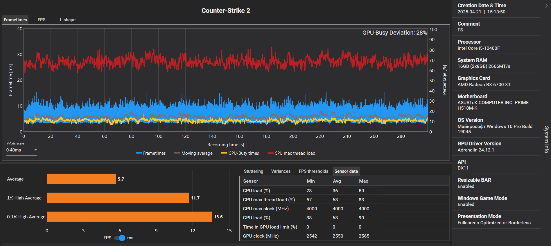 Djleks короче, про задротство тут не в тему. Ты жалуешься на фризы и грешил изначально на вк, или проц с памятью с нашей подачи. Про пинг и джиттер ни слова, значит я в тестах cs2 не буду пока их учитывать и логгировать онлайн катки при сравнении твоего 11400f+3200+6650xt c моим 10400f+2666+6700xt - будем искать причину фризов последовательно. Т.к. ты не указал условия своей статы с фризами, я начну а ты репитни :