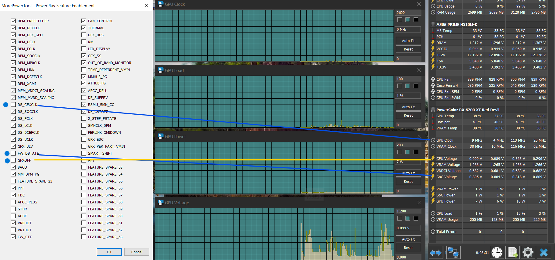 Видюха вела себя очень странно, при любых резких изменениях в нагрузке, она просто кидала частоту на 0, этим самым создавая провал в кадрах. Благоджаря отключению в MorePowerTool GFXOFF, FW_DSTATE, DS_GFXCLK частота теперь всегда держиться такая, как Я ее задам.