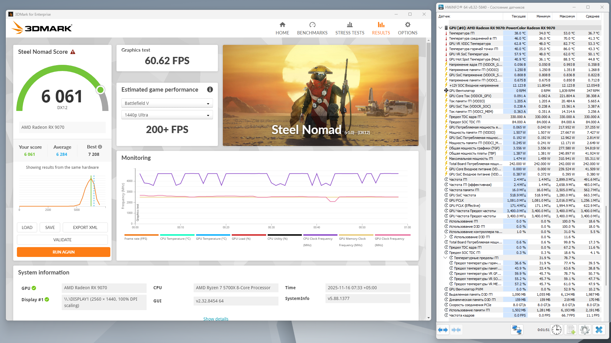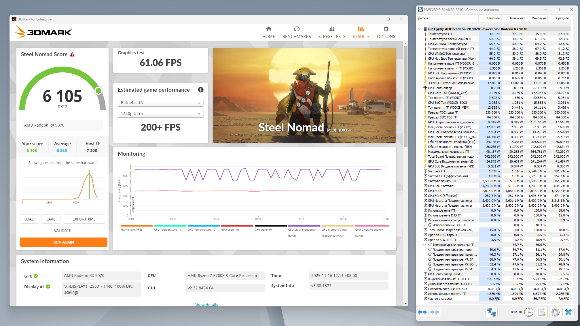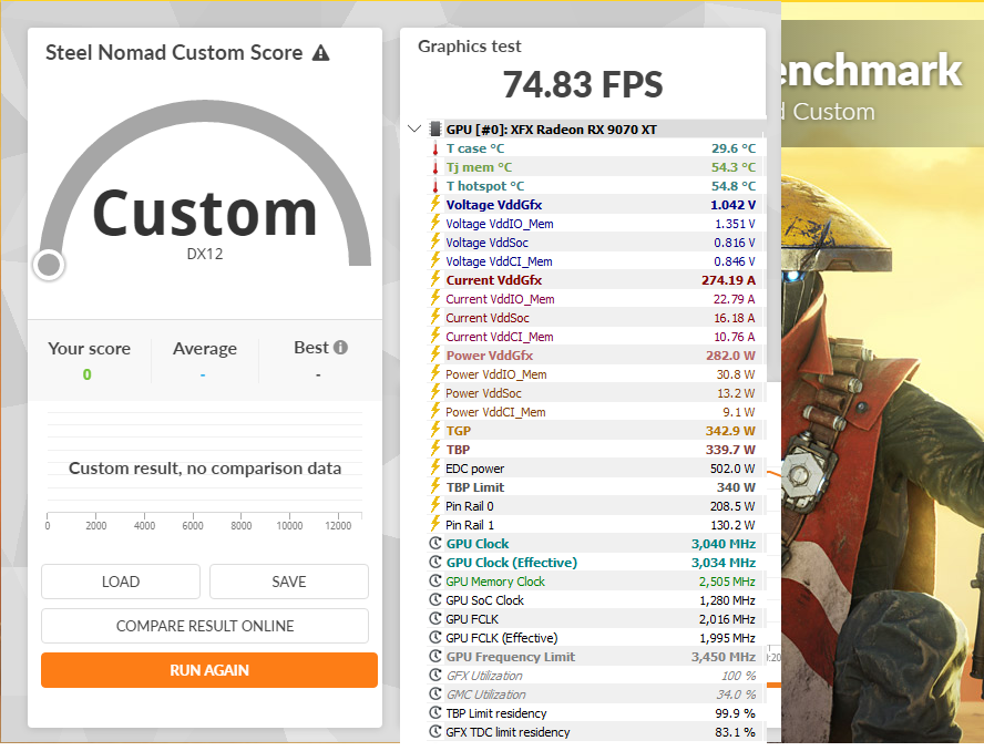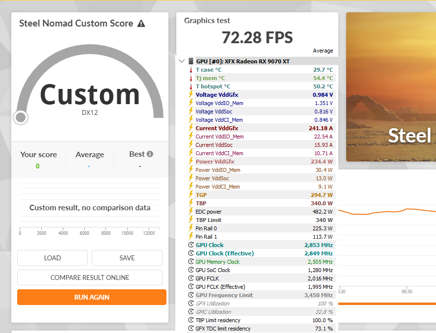 Вот для примера Nomad 1) в стоке 2) с разгоном памяти и 3) с лимитом TBP 400W колонка HWInfo - усредненные данные, polling interval 1 сек, UV 0, Clock offset 0. И кстати, обратите внимание, что средняя частота в стоковом прогоне выше чем с разгоном памяти, а с увеличением лимита до 400W увеличилась средняя на 200 Мгц, но рез-т всего на 50 выше. Такой разброс и шатания - верный признак дисбаланса производительности GFX Core и Memory Pipeline для конкретного SKU, Navi48.