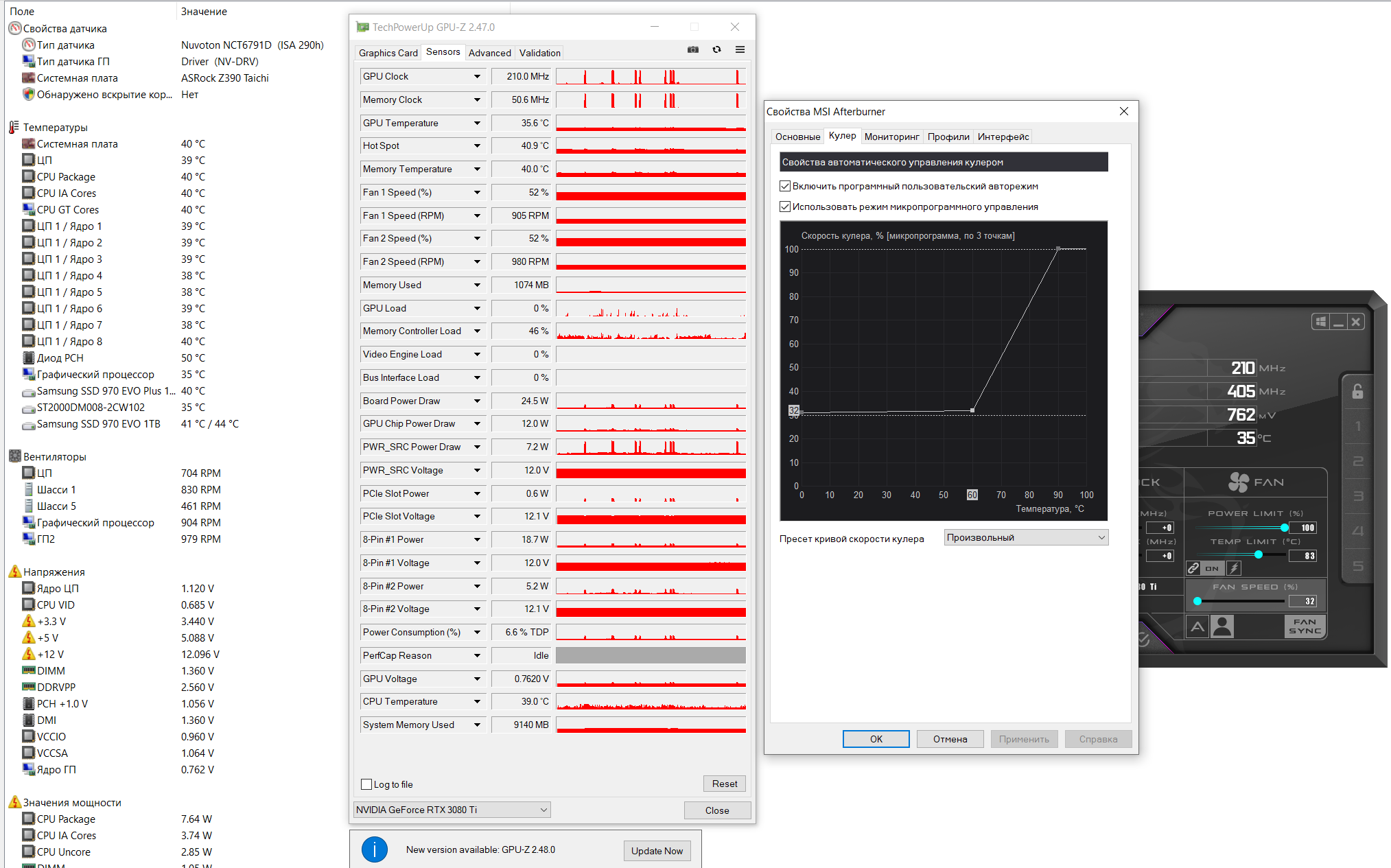 - Андервольт значит не поможет в простое - Если увеличить порог температур для запуска вентиляторов? Температура в 60 градусов по 16 часов в сутки повредит? - Если отключить подсветку, это не сильно повлияет? - В самом корпусе вроде не так горячо (судя по потоку воздуха). Но можно ещё сильнее продувать попробовать Перебирать карту внутри у меня навыков не хватит