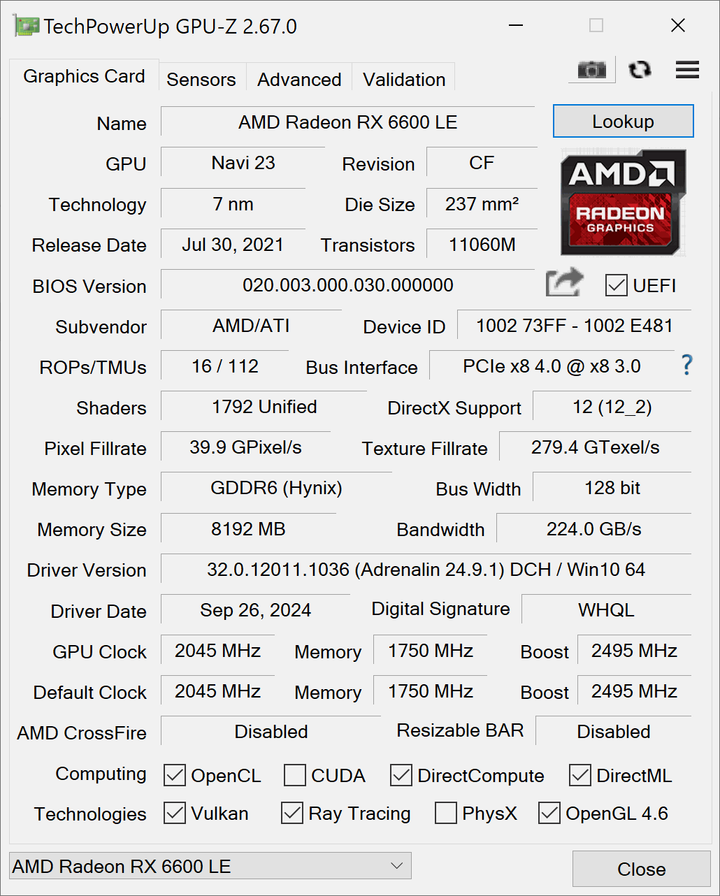 Купил ONDA RX 6600 LE 8Gb, материнская плата X99-QD4 32 Гб, блок питания Deepcool PF750, Windows 10 Pro чистая установка на NVME. Драйвер пробовал 25.8.1, 25.6.1, 24.9.1, про версию от 25 года. В биосе включил above 4g decoding. Рандомно виснет наглухо, приходится перезапускать кнопкой выключения, иногда вылезает зеленый экран. Брал через Вайлдберриз продаван забирать отказывается, открыл спор, вайлдберриз отказала тоже. Прошивка в плате от Lenovo RX 6600 LE. Все настройки (частот, питания, вентиляторы) заблокированы производителем, карта ОЕМ. Перепрошить на другую не могу, на плате не 4 H56CBM24MIR, а 8 H56C8H24AIR. Написал производителю и в АМД, пока глухо. RX 460 2Gb и RX 580 8Gb в этой конфигурации работают стабильно, уже долгое время.