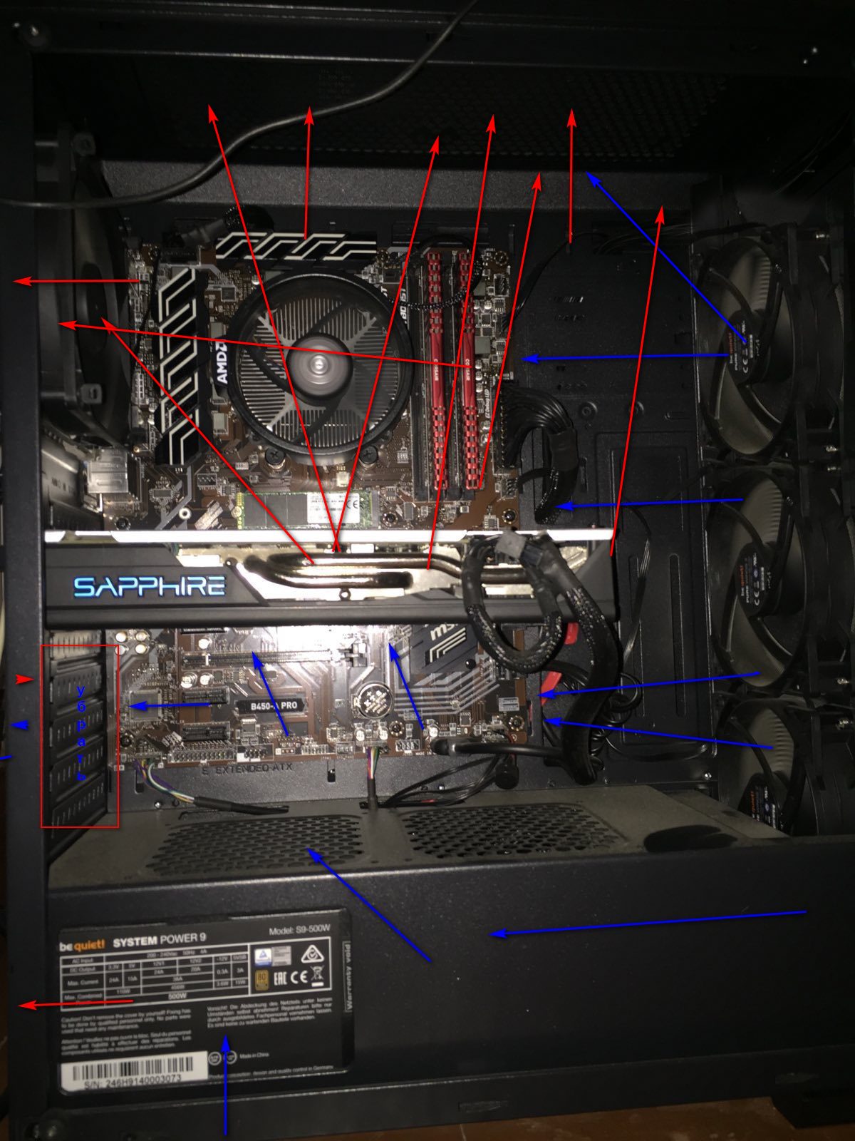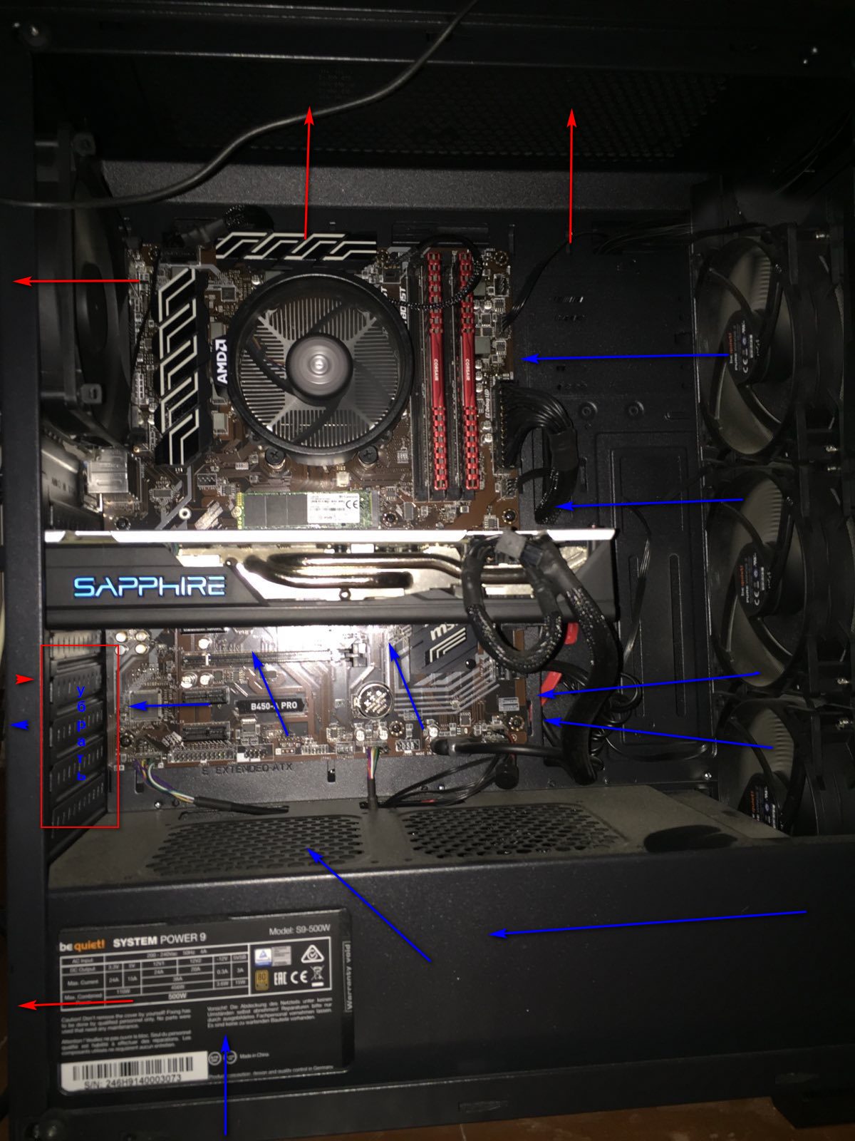 Перепутал, спать пора. Наоборот – теплый воздух от радиатора засасывается в БП. Как по мне, это не критично. Не знаю, почему все вдруг решили делать БП снизу – из-за удобства, разве что. А из зоны VRM прекрасно выкачивает тепло выдувной вентилятор сзади, который там ближе всего. Если мало, то еще добавляется сверху, ближе к задней крышке.