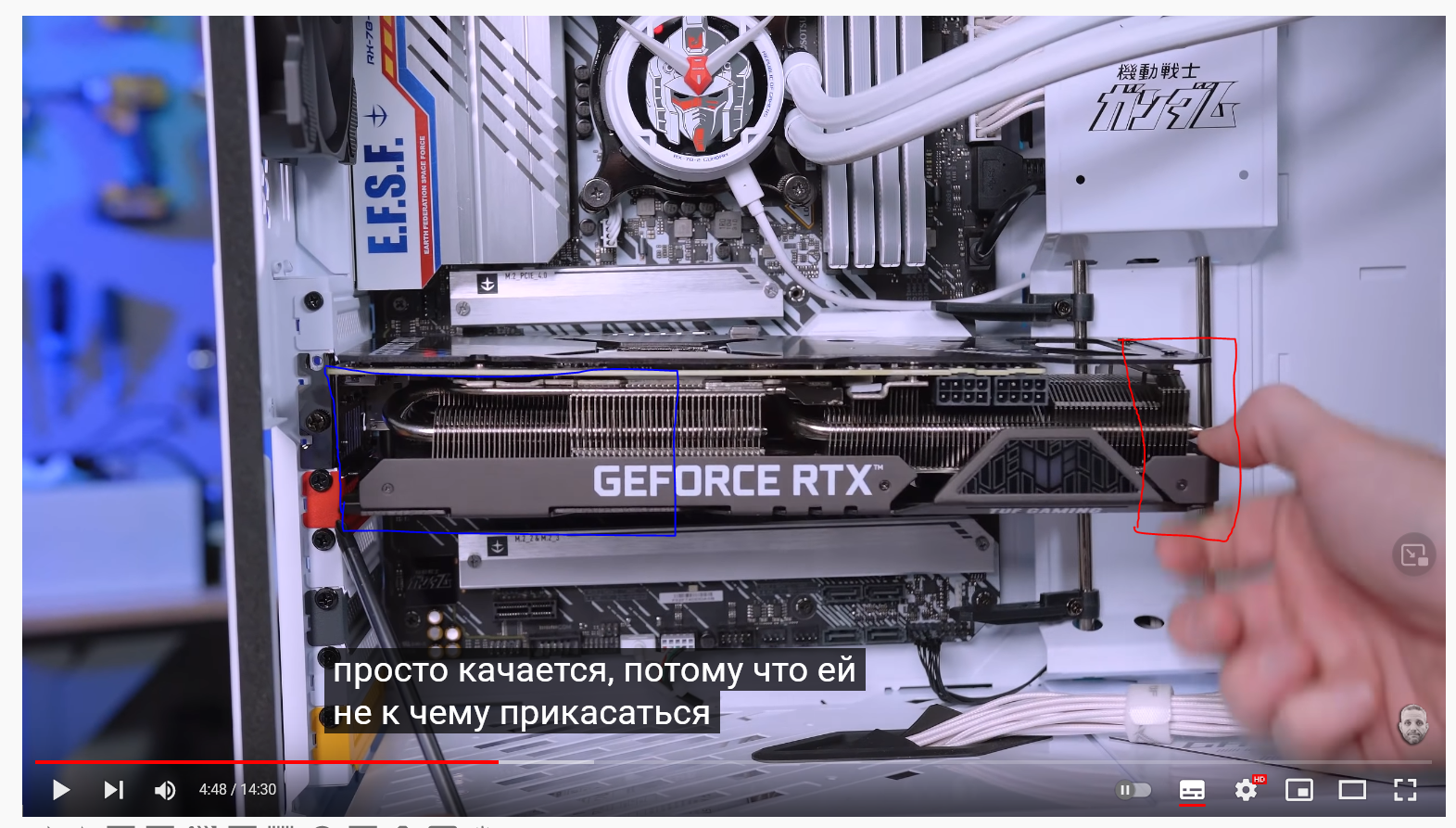 Увидел очередную порнографию с асус тафом, который как раз недавно приобрел... заметил что ближе к место где винтами она вставляется в слоты расширения вся конструкция болтается, а подпорку ставят обычно ближе к противоположному краю (в моем случае ближе к корзине с диками), куда лучше подпорку поставить и стоит ли ставить две? Upd. Взяв видео из ютуба выше, синим выделил часть которая при нажатии пальцем сильнее прилегает к плате, красным выделил то куда обычно ставят подпорку.