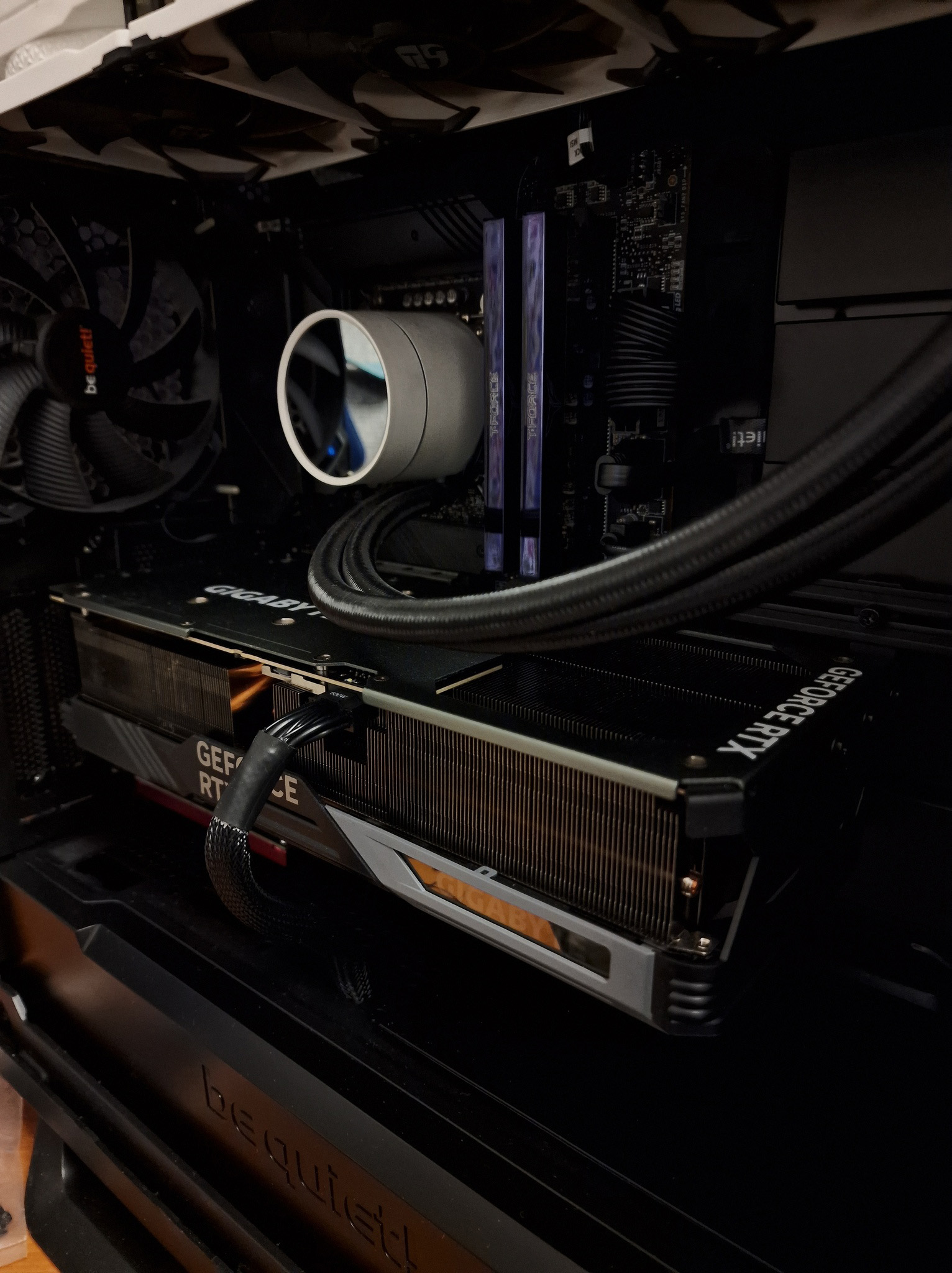 Прикупил Thermaltake Toughpower GF3 1200W с нативной поддержкой подключения 12VHPWR. Совсем другое дело, теперь нет этой многоножки из штекеров на переходнике. И главное тихо. Мой стары Chieftec POLARIS 1050W ревел как вертолёт, при любой нагрузке на видеокарту выше 300 Ватт. Корпус be quiet! SILENT BASE 802, боковая крышка закрывается нормально: