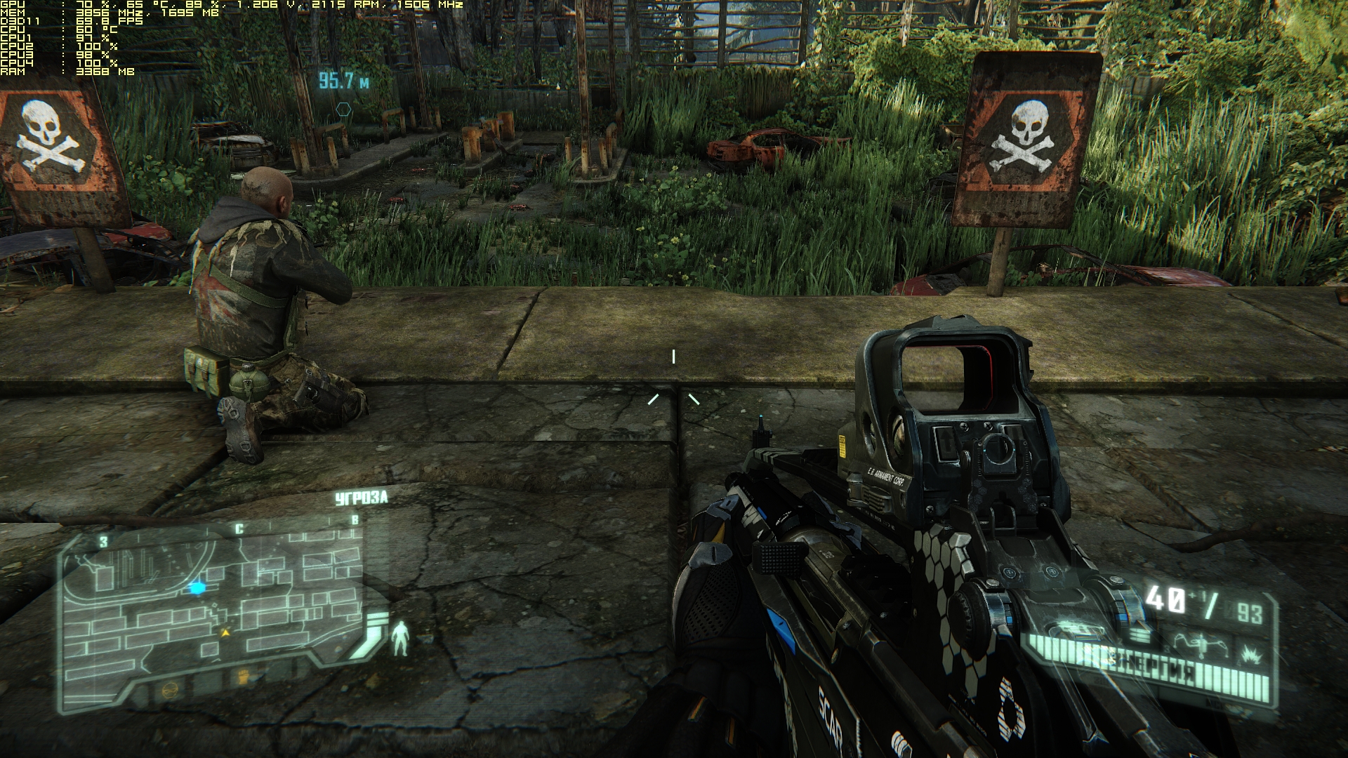 Вот сделал скриншот на системе i5 6600K @ 4300MHz + видео Гигабайт 970 Г1 @ 1506/7700MHz, место в кризисе 3 где реально не хватает I5 и загрузка видеокарты падает до 86%.