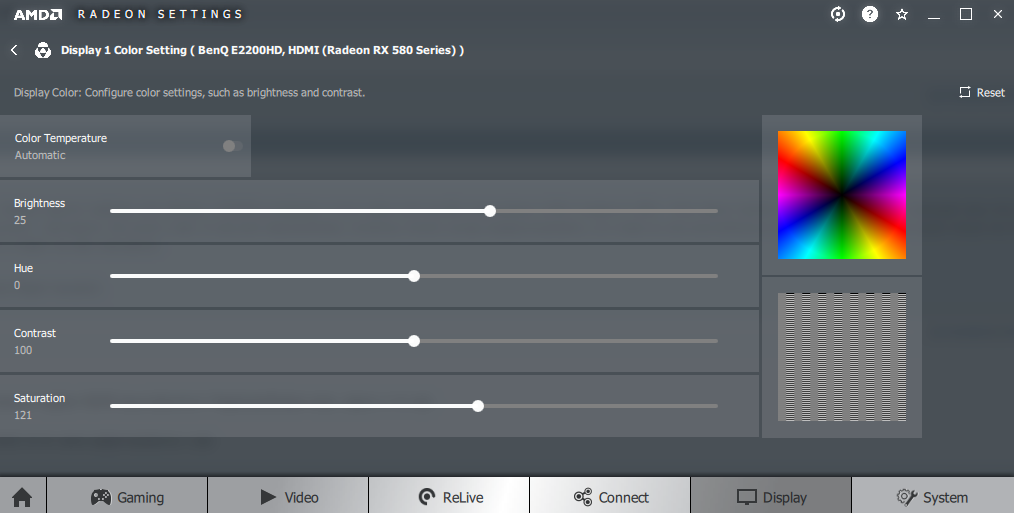 Auto выключает цветокоррекцию (LUT) драйвера, и в этом случае монитор показывает те цвета, которые он может показывать. Установка цветовой температуры на любое значение (6500 по умолчанию) включает цветокор драйвера и, надо сказать, что цветокор у АМД отличный.