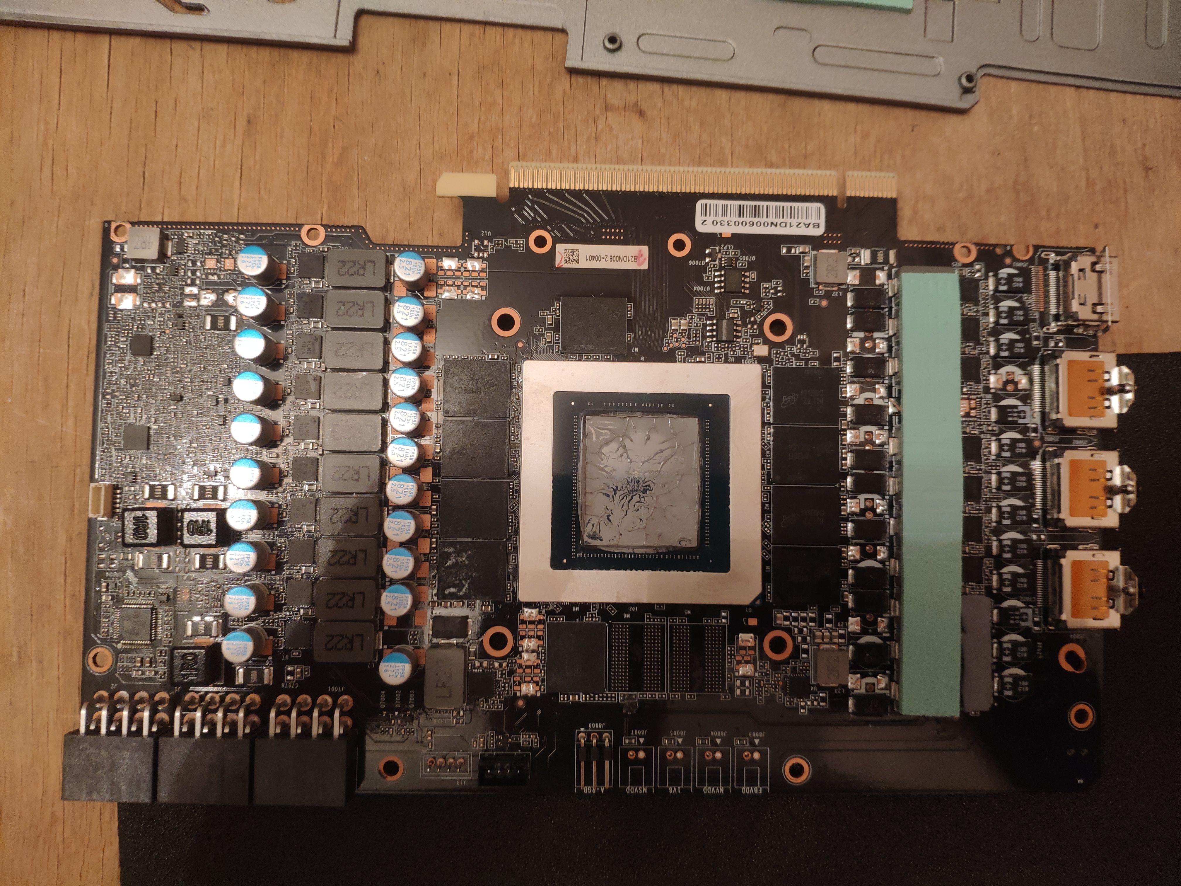 У кого у всех? Вот тебе скинули пример заводского термоинтерфейса. Всё о NVIDIA GeForce RTX 3080 | RTX 3080 Ti | RTX 3090 (GA102 Ampere 8nm) #17794297 Разуй глаза, вот как паста с завода наносится. Тонкий слой, видна вся поверхность под пастой, ровные края по трафарету. У тебя же толстенный слой, такой толстый, что даже на чип выдавило.