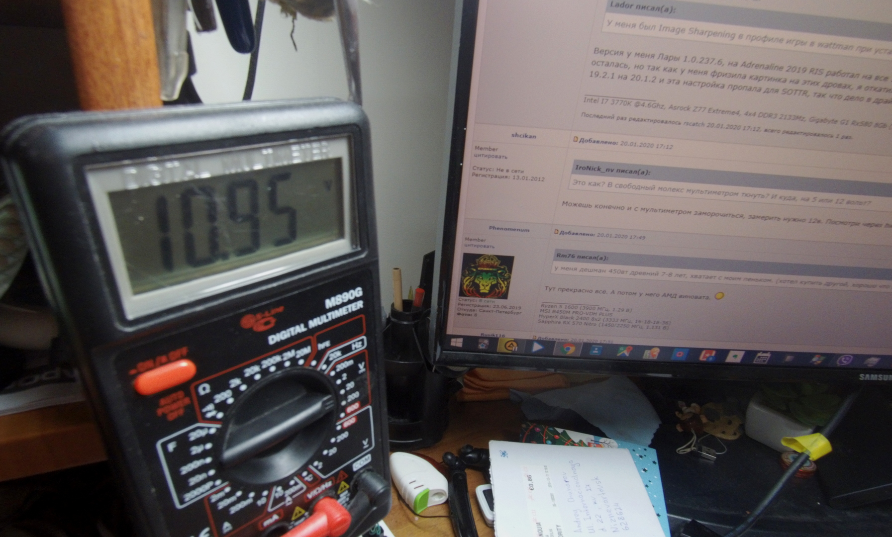 Это под нагрузкой 45 минут в FurMark. И это разогнанная в AB до 1300МГц - GPU, и 1950МГц - память (я, так понял, RX470 до 2000МГц тайминги не трогает). По дефолту - 11.72В в FurMark и Heaven, в разогнанном состоянии 11.40В с редкими качками скачками до 11.60В, в FurMark -11.22В с опусканием до 10.95В спустя 45 мин.