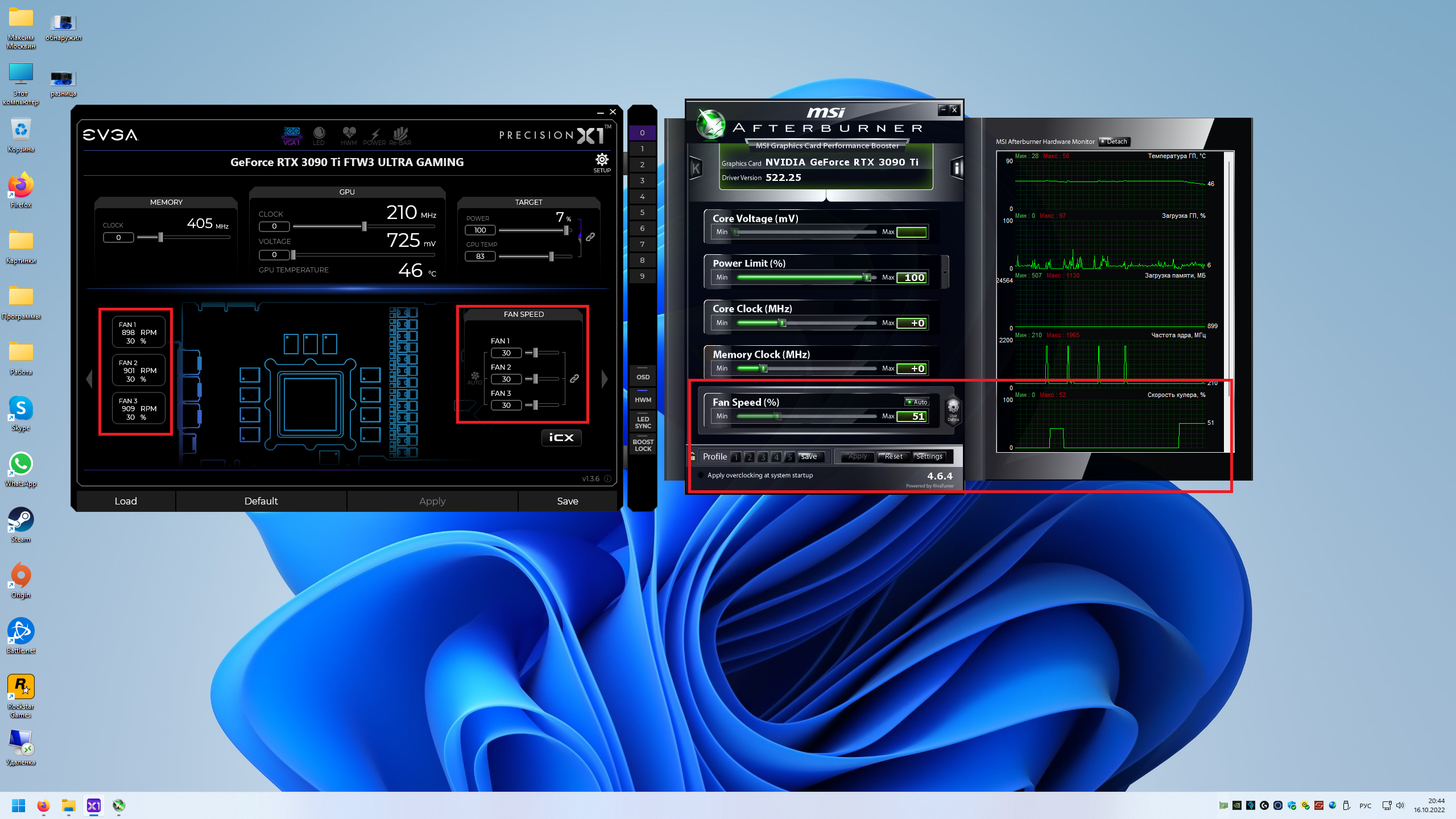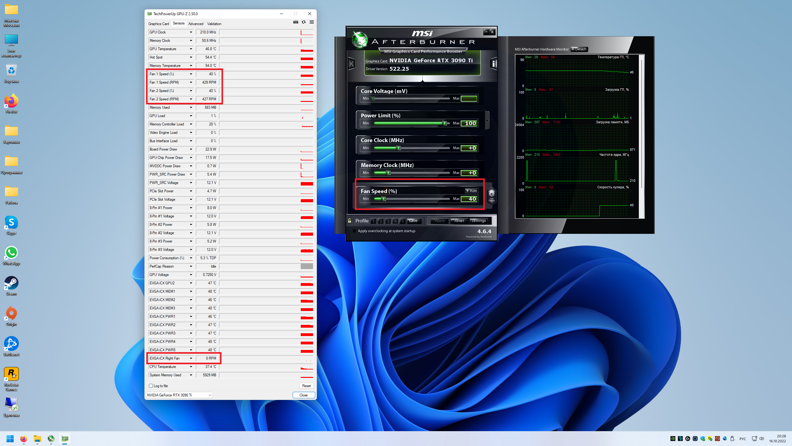 В общем и целом с картой то все ок, тесты проходит нагрузку держит, охлаждается нормально при учете 450ват тдп, под нагрузкой 71* гпу и 84* по памяти, считаю данные значения нормальными, по шуму тоже очень и очень достойное решение, если в ручную выбрать в PrecisionX1 пресет Stealth вообще тишина и гладь. Но у моей карты я обнаружил весомый недостаток, а именно работа вентиляторов при малой нагрузке и минимальных оборотах. Ниже видео для ознакомления и понятия причины: https://www.youtube.com/watch?v=eqG56QuPgH0 Управление вентилятором через афтербурнер: запуск вертушек с 35% , 25 секунда видео включение их на 50%, 45 секунда запуск вертушек на 93%.