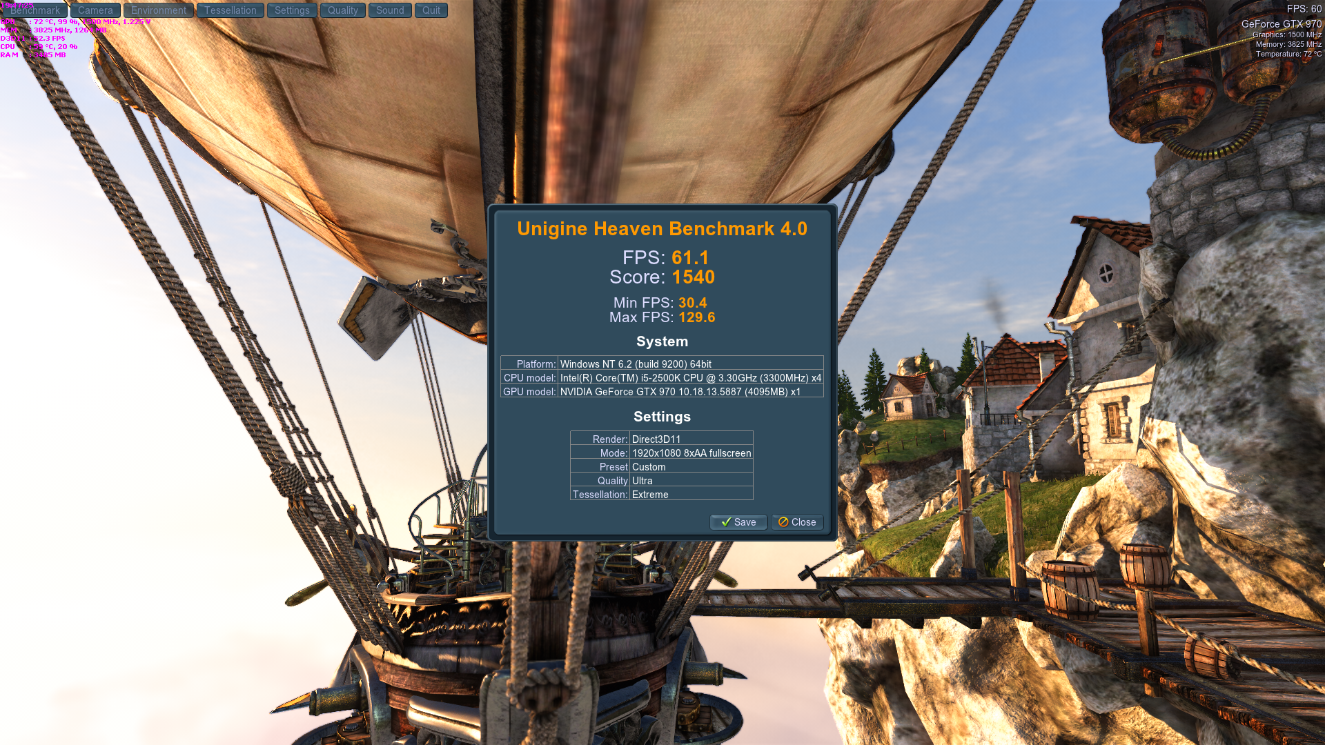 Жесть... Уже год прошёл, как купил 970-ю, а вы тут всё Хэвенами меряетесь Вот вам в копилку мой скрин На рабочем, так сказать компе, драйвера по умолчанию, в фоне крутится уТоррент (жрёт 15% проца по ProcessExplorer-у). Второй прогон, не выходя из приложения. И вообще, минималка почти до конца была 40, потом 2 подлагивания при смене сцен - и вот всего 30. Думаю, если раз 10 прокрутить, то всё закэшируется и минимум будет 40.