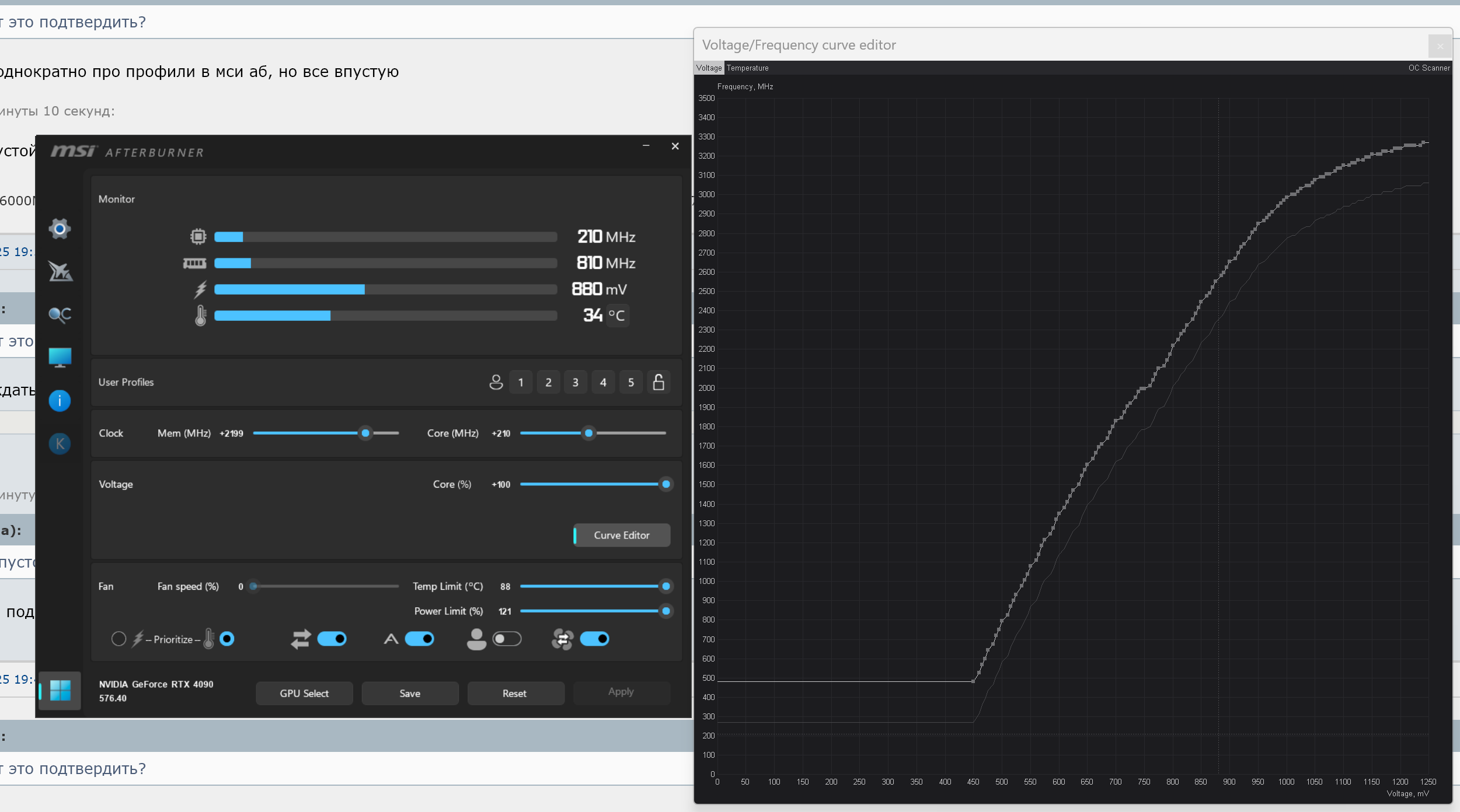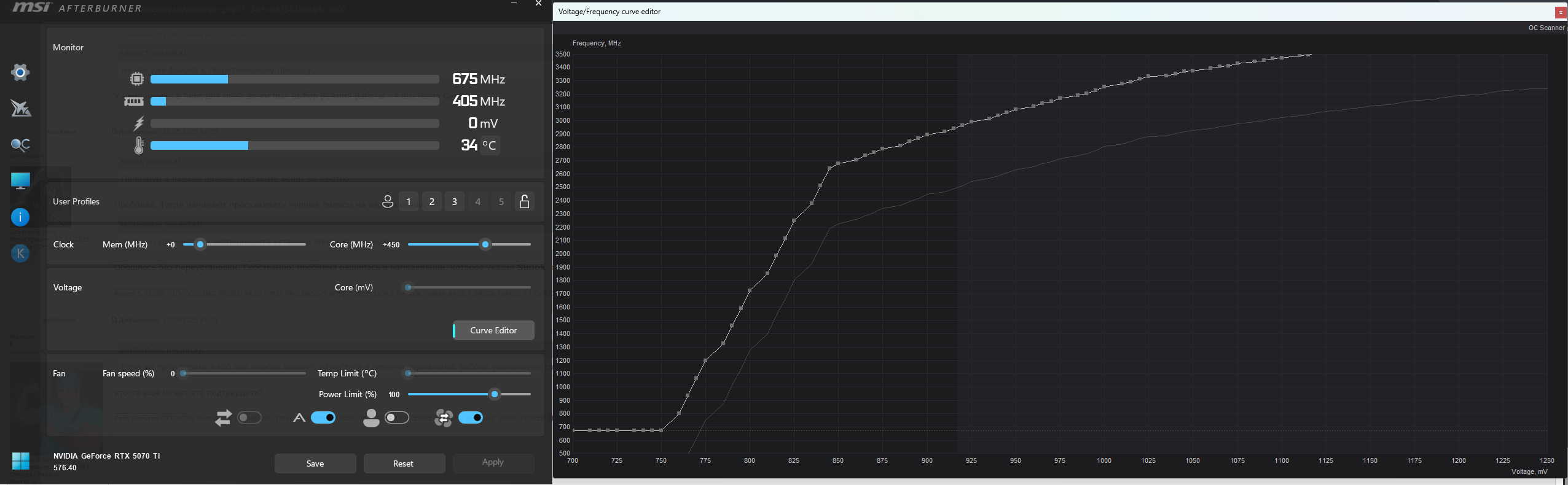 С вентилями отлично всё, не звинят, не трещат, под сильной нагрузкой слышен только шелест воздуха (1900+ оборотов). Дроссели не пищат. Когда из фанстопа выходит никаких призвуков не издаёт - абсолютно бесшумно переход выполняется. Корпус стоит на столе менее чем в метре от уха. Про разгон и андервольт. У меня OC версия, но долбится в 300Вт лимит. Я зашил биос с 320 лимитом от Asus Strix 5070Ti https://www.techpowerup.com/vgabios/276254/276254 Из коробки в Steel Nomad часто долбится в лимит 315-322Вт, бустит до 2827-2872 с напругой 1030-1040. ~69 fps. При разгоне до +450 постоянно долбится в лимит 320Вт, бустит выше 3200 с напругой 1000-1015. ~73 fps. В обоих случаях кульки разгоняются до ~1900+ оборотов, тем-ры 65-69 ядро, 68-72 память. Слышен только шум воздуха от видеокарты, комфортно. Всё ещё тестирую и пытаюсь найти баланс тишины и производительности в моём миниатюрном корпусе. Тестировал и 3000, и 2900 с андервольтом, разница не сильно велика в потере производительности - 2-4 fps. А вот жор падает хорошо. Андервольт делаю через метод, который тут описывали, тот который в бета версии AB появился - выбираю ту частоту-напряжение к которым стремлюсь, и лочу одно значение напряжения выше этого значения через нажатие L два раза (тогда при нагрузке более стабильно работает на той частоте и напряжении которое мне нужно, берётся значение частоты-напряжения на одно значение ниже того значения, которое я залочил, частота и напряжение редко прыгают, если сравнивать со старым методом с выпрямлением кривой). Только я ещё тяну курву вверх через Ctrl + левая кнопка мыши на уровне 970 и вниз на уровне 750-877 - тогда верхняя и нижняя часть курвы двигаются сильнее, чем противоположная часть. В этом случае получается нижнюю часть курвы сделать близкой к оригинальной курве, и на низких частотах нет сильного овершута, и частота нормальной работы карты без нагрузки остаётся дефолтной 225Мгц. Если же тупо делать +450 как многие делают, то частота в режиме нормальной работы увеличивается до 675 Мгц вместо 225 Мгц. На скриншоте видно, что нижняя часть очень близка к оригинальной курве.