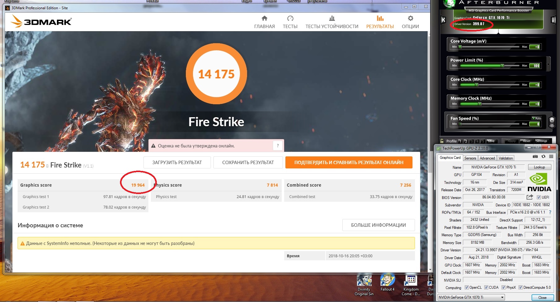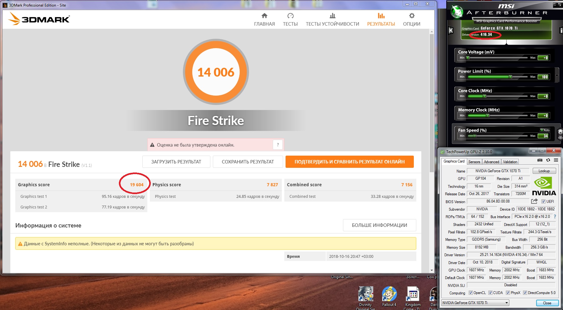 Может карта да система в целом более прогрета была,бус с ростом темпы больше упал ??? Я тоже попробывал ,и у меня ситуация такая. Fire extreme и time spy extreme есть прибавка 50-80 попугаев, и так же (что удивило) есть небольшая прибавка в обоих бенчах по cpu scoore . А вот fire strike обычный минус 110 попугаев ,но так же и прибавка по cpu . Конечно мне пофигу на подение 0.5-1 fps , лижбы не было подений с каждыми новыми дровами. Вернулся обратно и все стало так же как и было. Дрова были 399.24 и 416.34 Скрины сори не кидаю, просто лень.