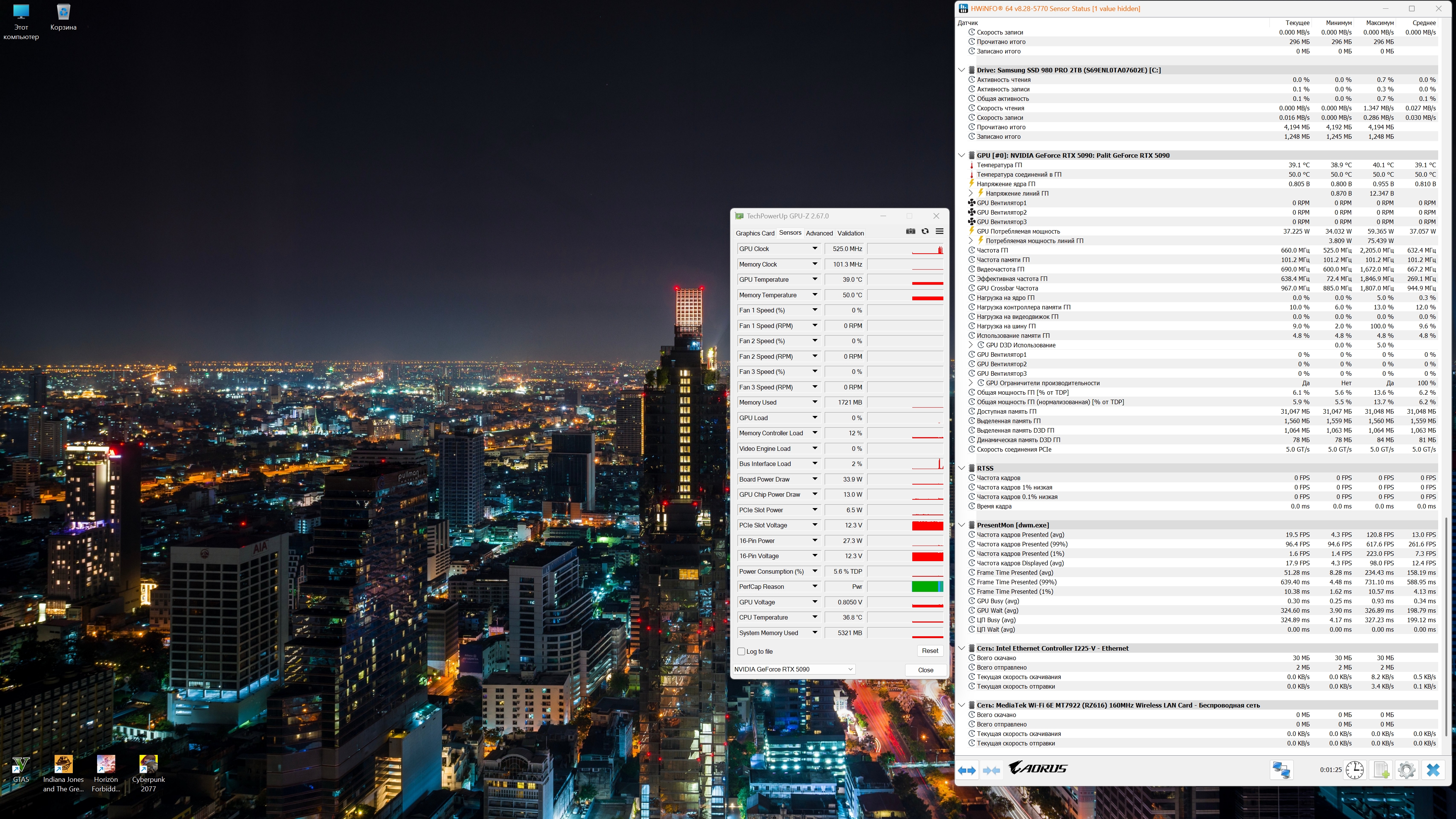 Хочу все-таки попросить владельцев 5090 покидать скринов системы в простое, примерно так, чтобы потребление и частоты видно было. Только по возможности без лишних фоновых прог.