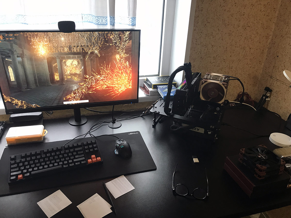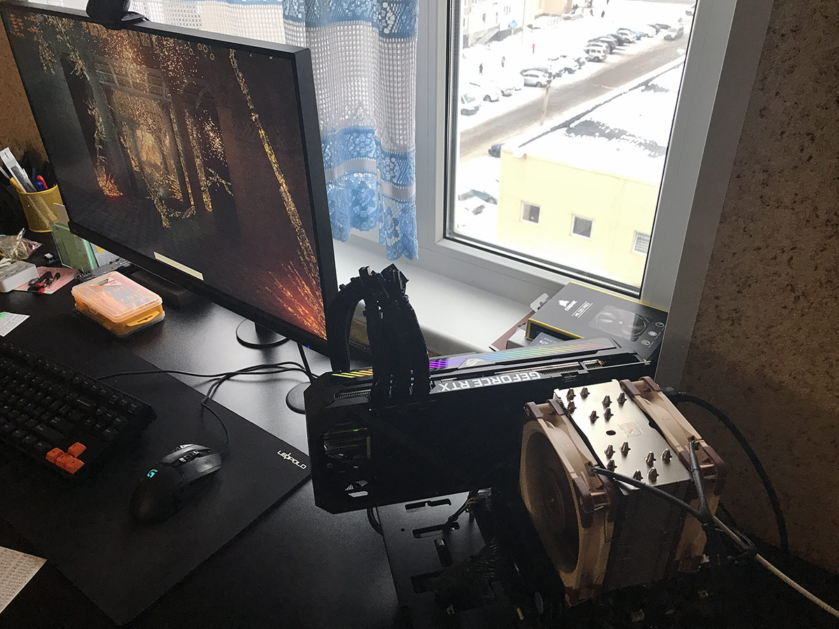 Phanteks Evolv X, вентиль приклеил на двусторонний скотч, чтобы усилить обдув видеокарты. Карта далеко не холодная, бекплейт ощутимо горячий. И да, это мой первый в жизни Палит, ранее были только топы Асус, МСИ. Не вижу смысла платить на фетишы в виде ТАФов и Стриксов =))) Качество давно сравнялось примерно у всех производителей, чипы разогнаны в хлам с завода.