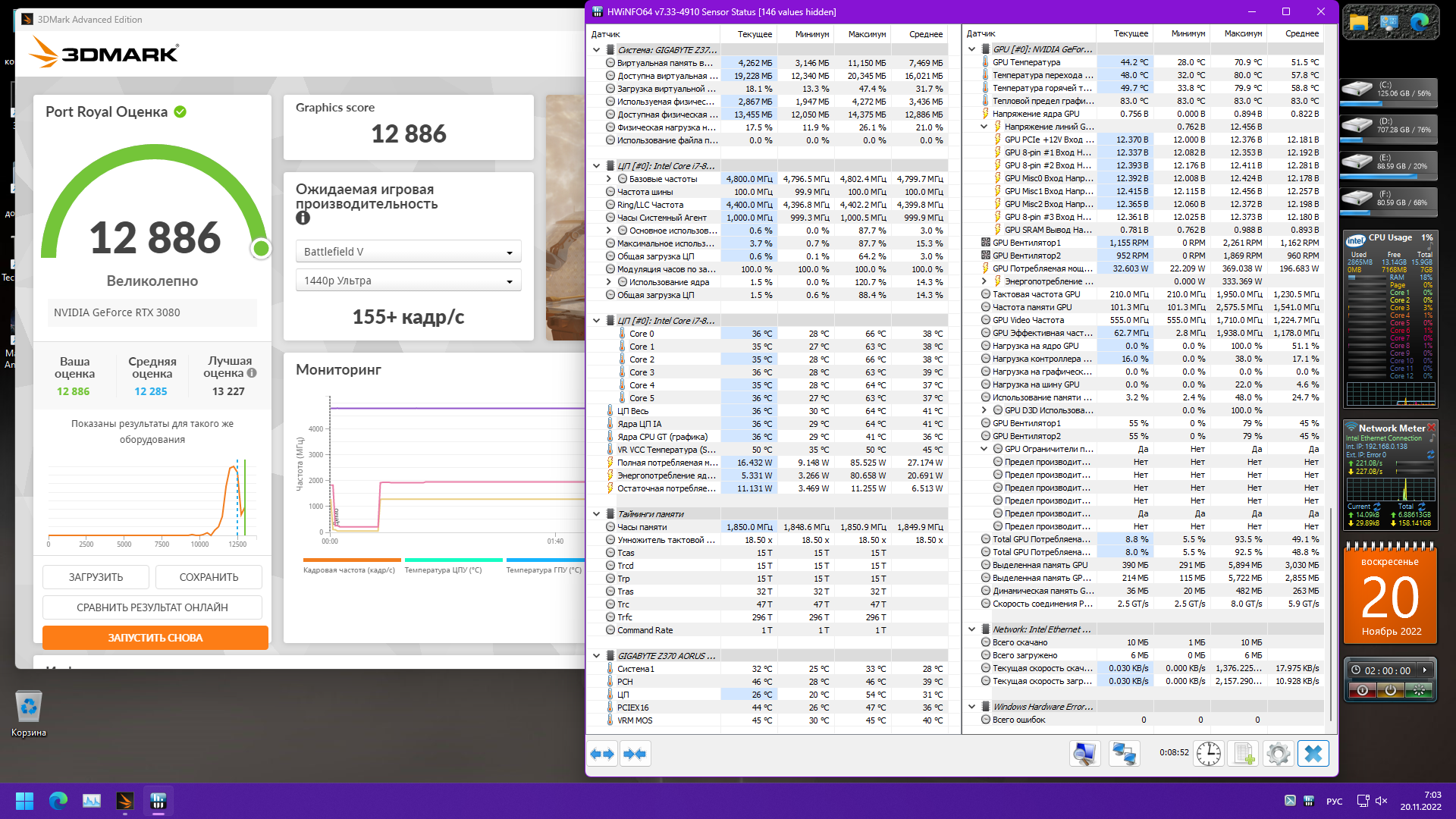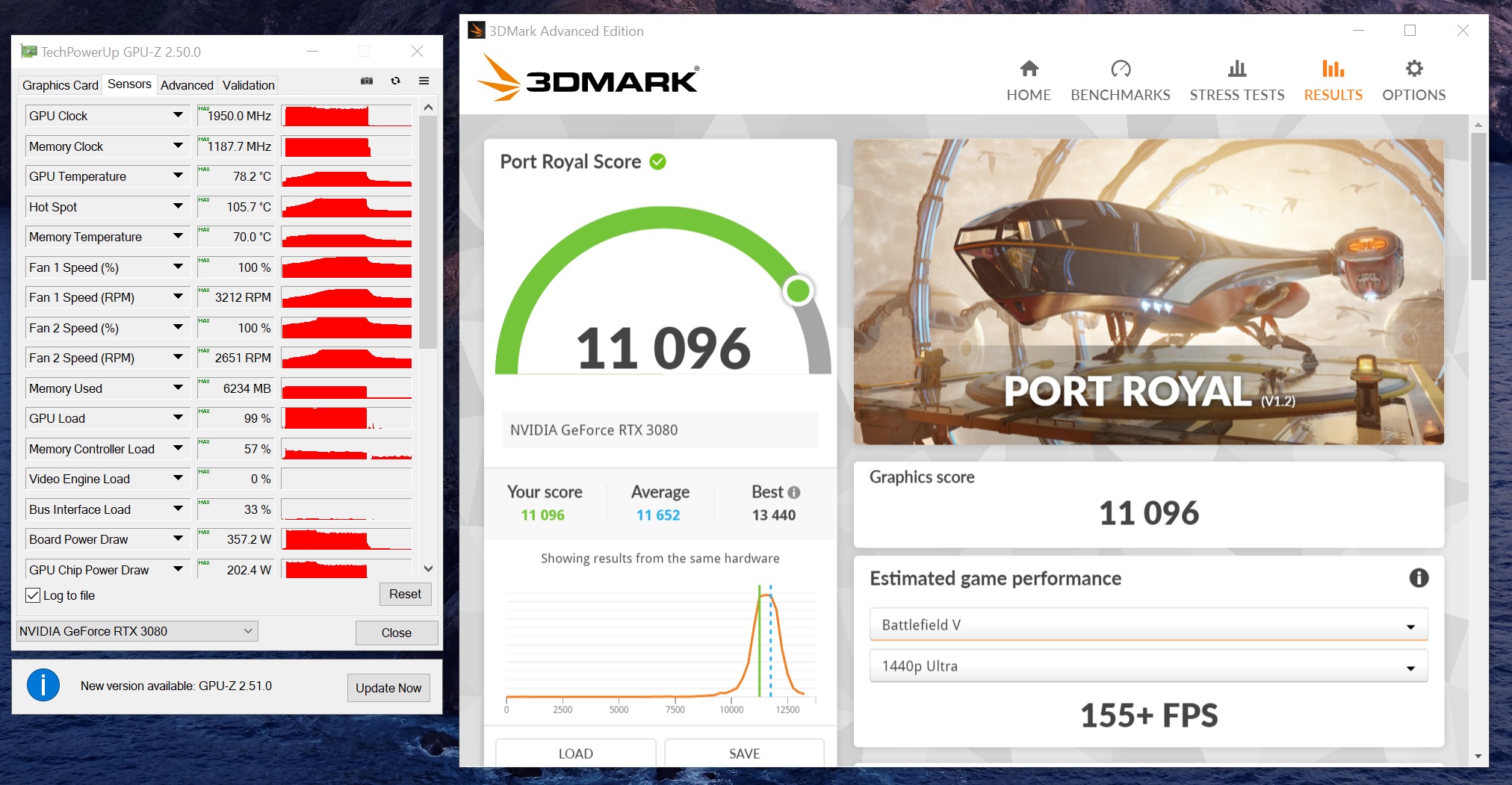 Вот сделал свежий прогон. Пугает даже не столько температура ядра 78С, сколько раскрутка вентиляторов, шум дикий. 3200 оборотов. Страшно за карту. Попугаи тоже низкие, проц 8700К@4.8, но он тут роли не играет, я так думаю..А вот по памяти проблем нет с температурой