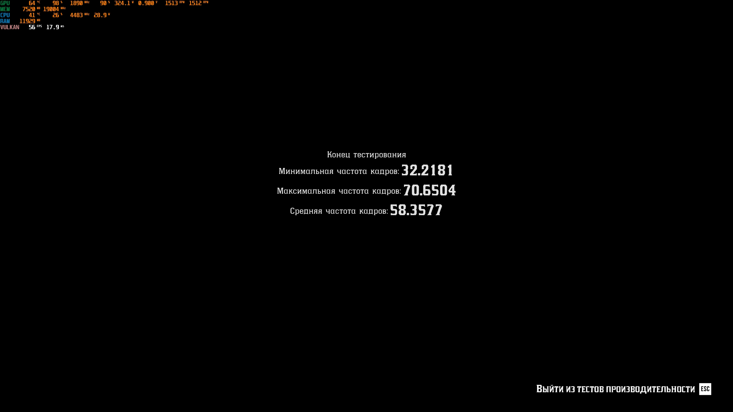 Наконец добрался до компа. Пол часа выставлял настройки как у тебя на скриншотах. 1890MHz/900mv 350W avg: 58.35fps