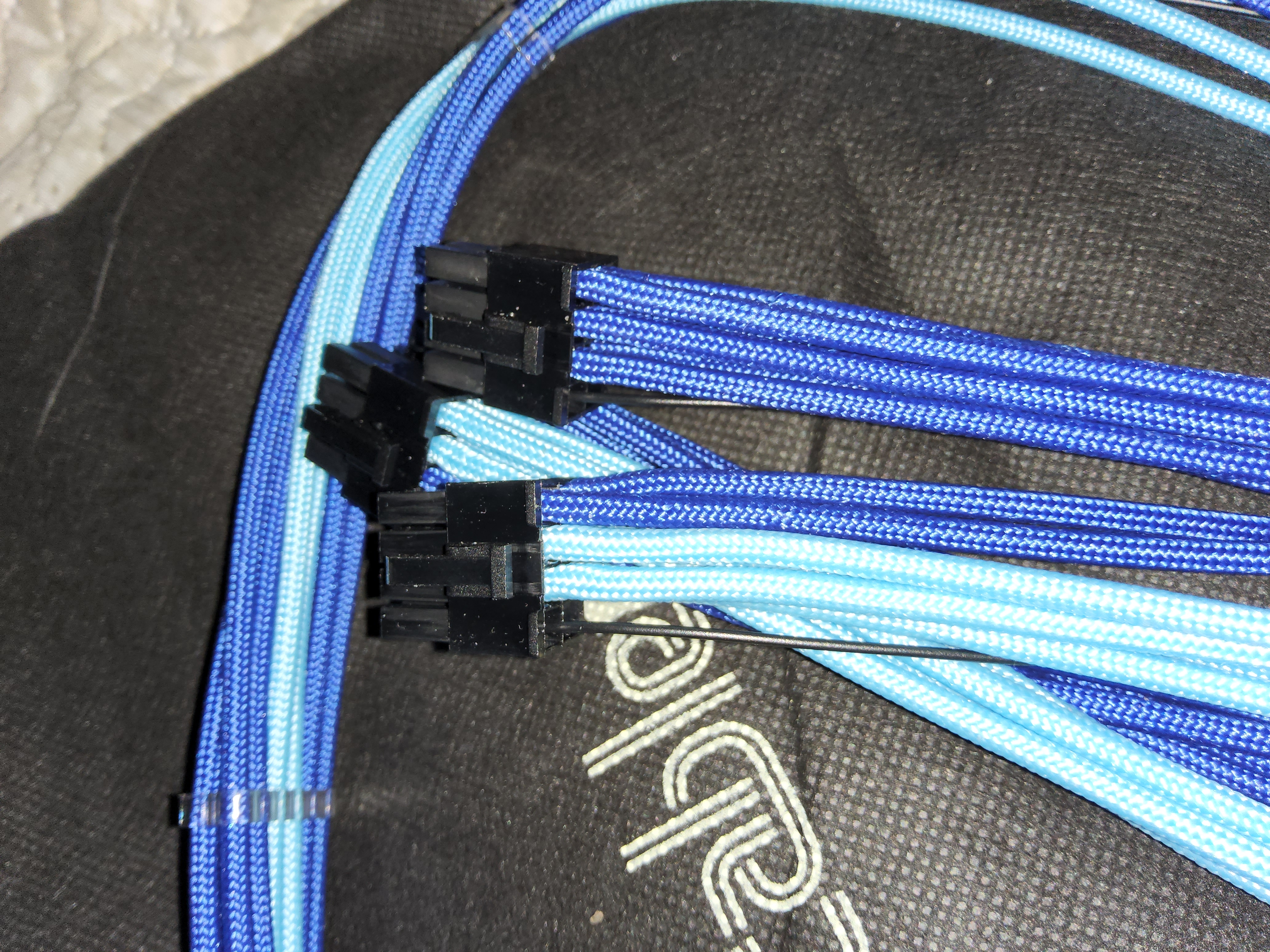 Цвета я сам выбирал,у меня вода синиая, там можно хоть каждый провод другого цвета сделать. Блок питания у меня corsair hx 1000,тут кто-то писал что на эти блоки корсар только с 1200ват работает на все 600ват а на 1000ват 450 только с родным проводом даёт. Может потому 4 провода к блоку, потому что на картинке когда заказывал было 2. Длину провода тоже сам выбираешь, надо было короче брать.