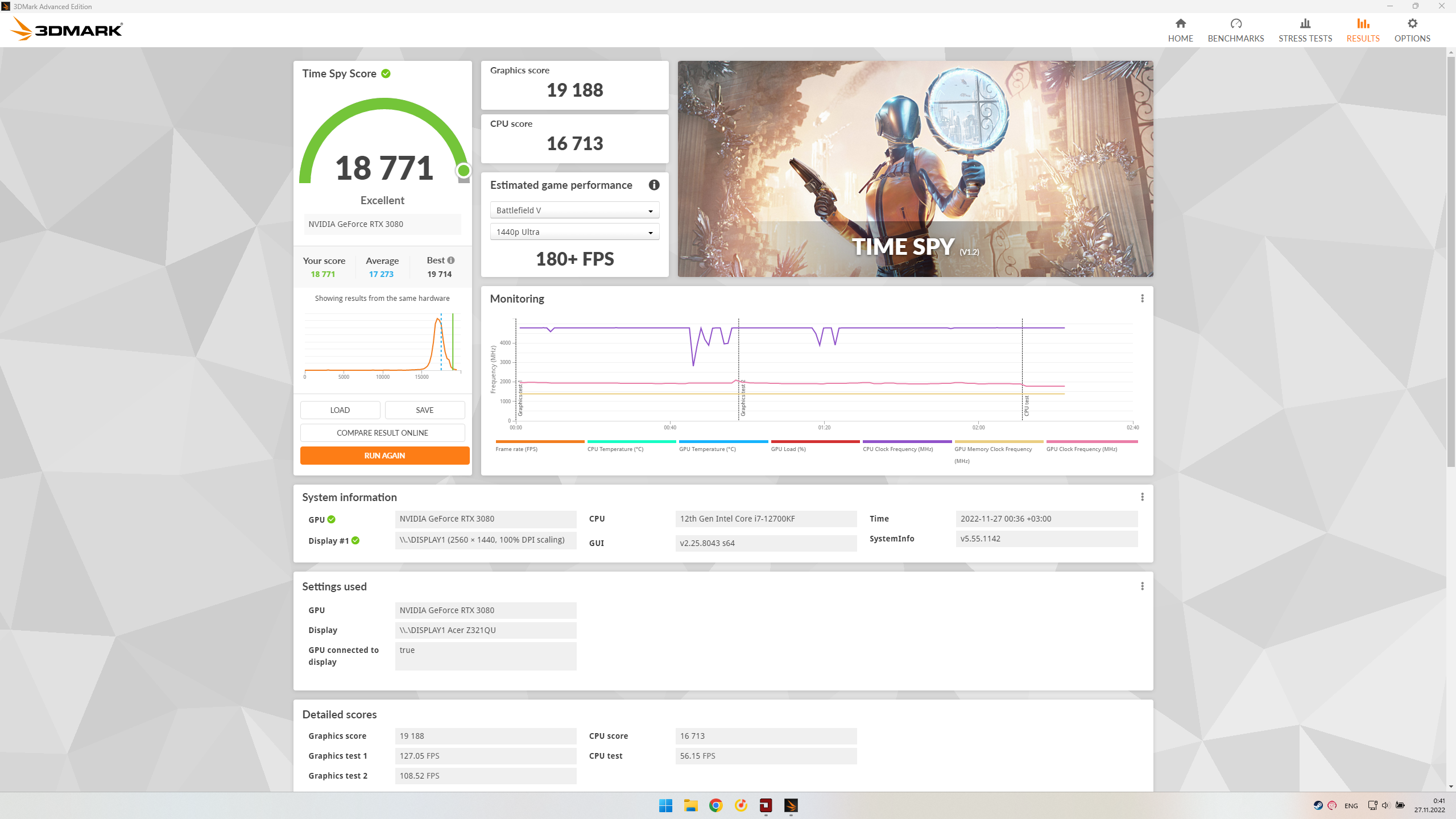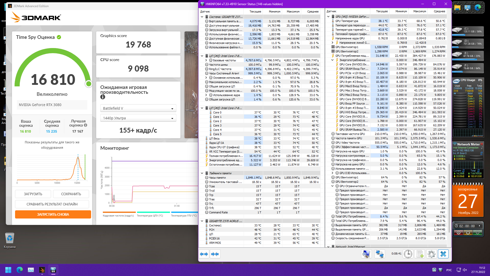 После долгих проверок на полную стабильность в длительных тестах и сессиях в тяжёлых играх, можно и 3dmark прогнать с частотами установленными на постоянку - 1935 MHz по GPU и 22212 MHz по памяти. Действительно, память попалась уникальная, а вам огромное спасибо за ссылку на тест, который мне очень помог завершить разгон памяти. Может и процессором как-нибудь займусь, хотя, наверное, раньше сменю на 13 поколение.