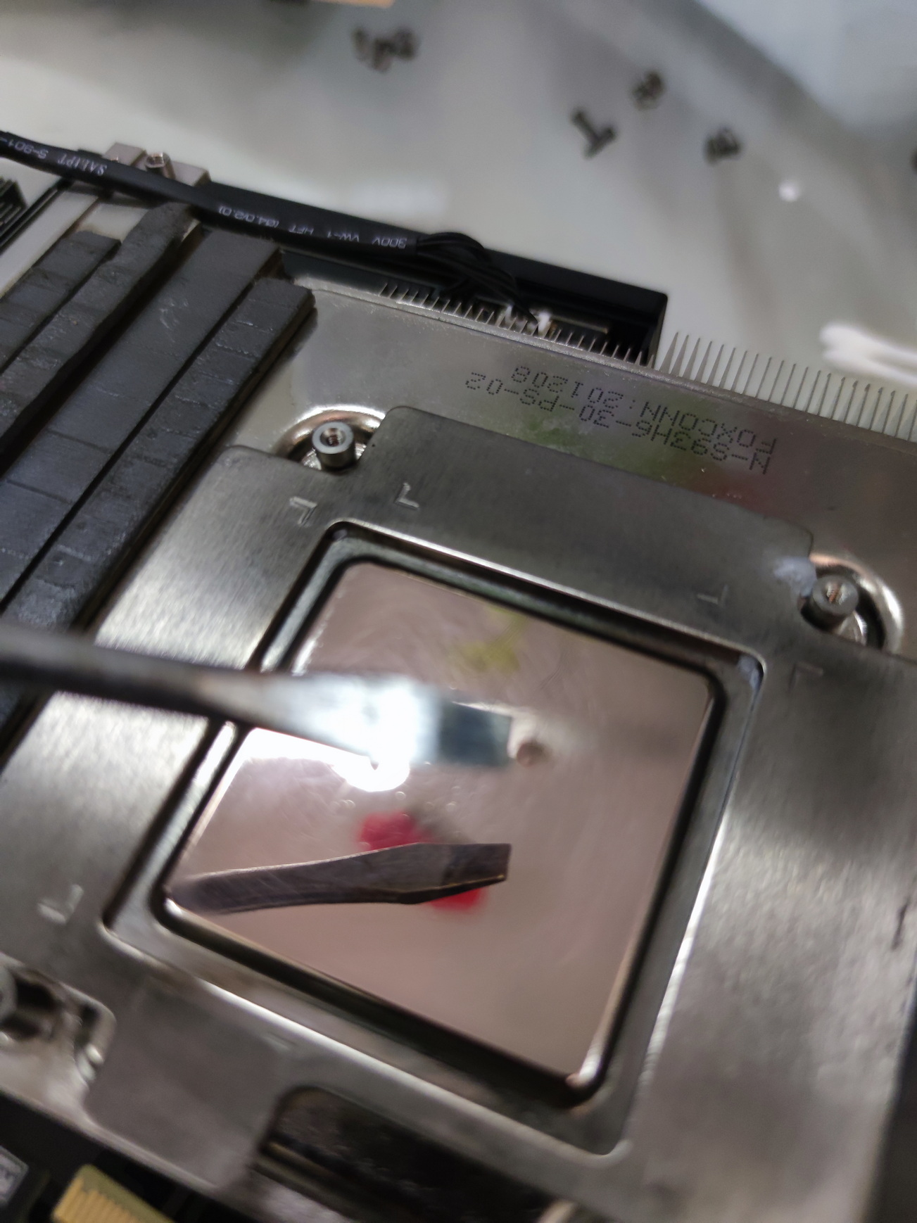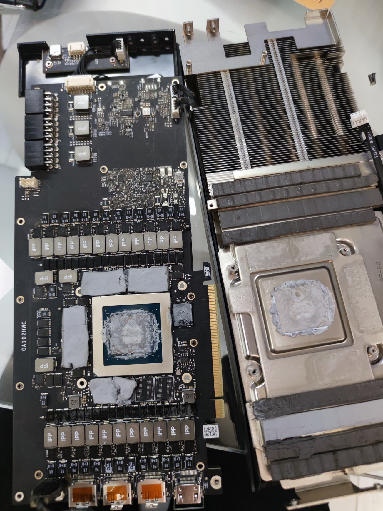 разобрал для замера прокладок. прокладки на память показались уставшими. на питание - вполне живые. на памяти 2мм прокладки. заказал киберблад прокладки, как уже проверенные мной. намазал пасту киберблад для теста (так как когда махну прокладки на память переведу ее на ЖМ.) . перед этим отполировав основание радиатора, оно было очень шершавое и трудно поддавалось полировке. если на 6800хт мне хватало 1 прохода полиролькой чтобы вывести основание в зеркало, то тут я 5 проходов сделал.