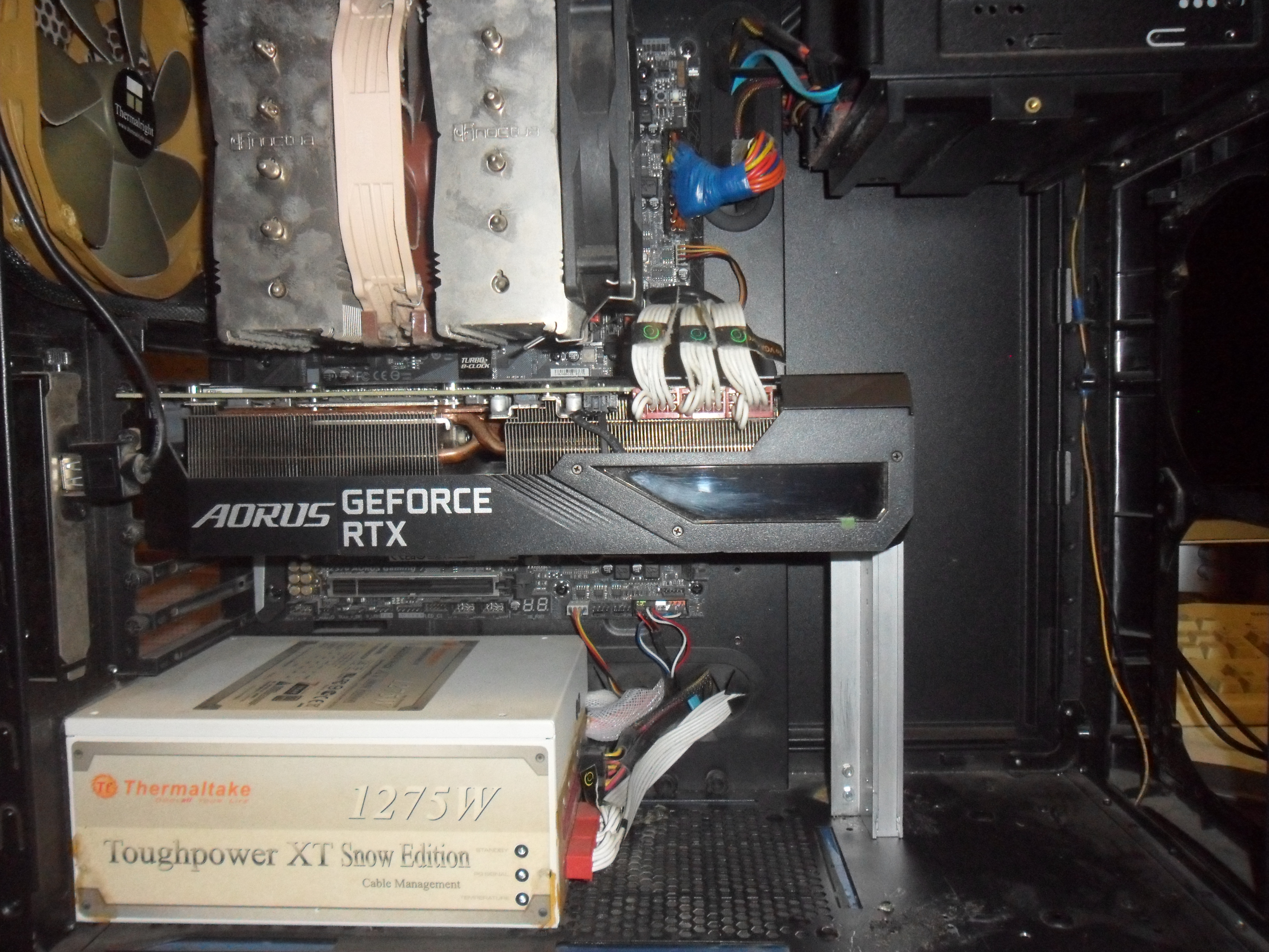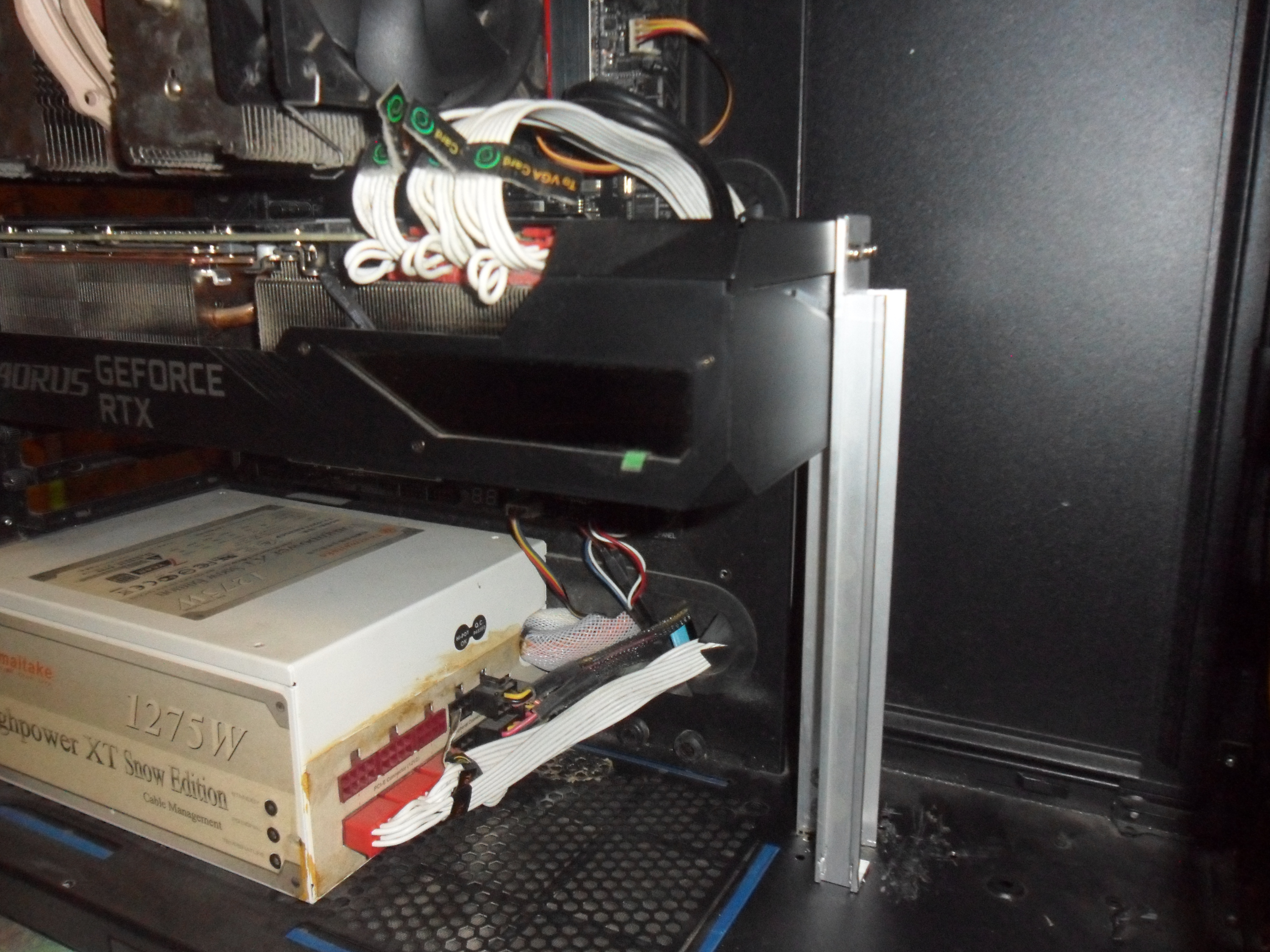 Прочел как то в ветке 4080-4090 что гиги идут с кронштейнами под крепление справа и винтами крепятся к карте, глянул у себя и обнаружил тоже пару площадок на беке с резьбой под винт, даже как то не замечал и не думал. Ну а дальше дело техники, нашел болванку радиатор алюминиевый с телевизора соответствующего размера, ну а пилить сверлить мне вообще не проблема. И получилась довольно жесткая конструкция, образно хоть в футбол играй теперь системником.
