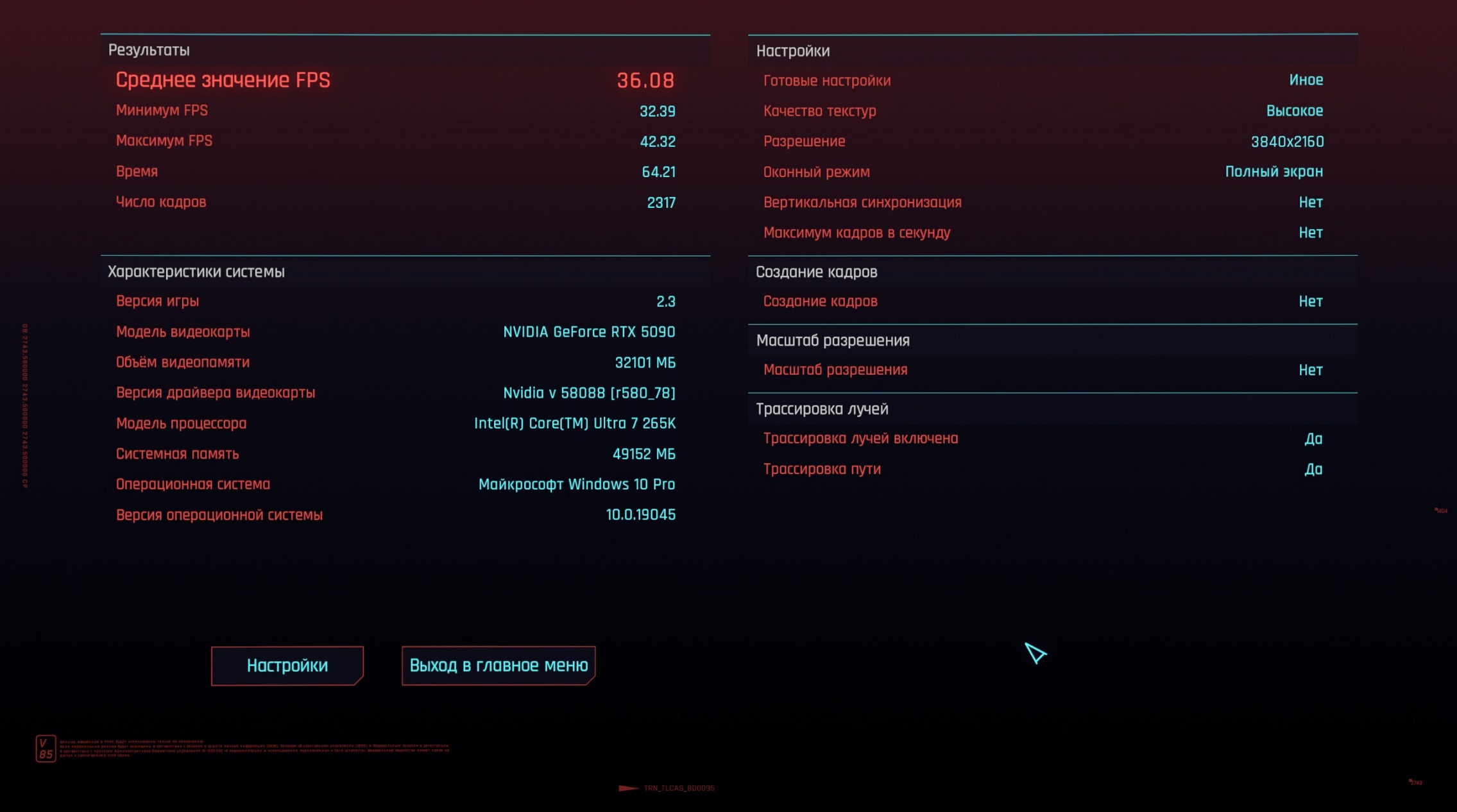 she1tanivanch88 Там процессор вообще не влияет в 4к на нативе, хоть 6 ядерник. 0 фпс тебе там даст даже 9000 память. Вся суть в том что вы балаболы)))) накрутили 100% обороты вентилятора и разгон +400мгц ползунок +3000 памяти и пытаетесь вкинуть эту чушь. Там в стоке 32-33 фпс на 5090 если что. В Разгоне без шунта на воде в районе 38. Видео же никто не снимет да из вас с мониторингом и настройками? Ну школота развлекается все понятно, чёт вас в бенчмарках не видно. Как вы в даунвольте нагибаете, если что 38 фпс в 4к киберпанк это 16500 примерно в стил номад))) и это точно не даунвольт.