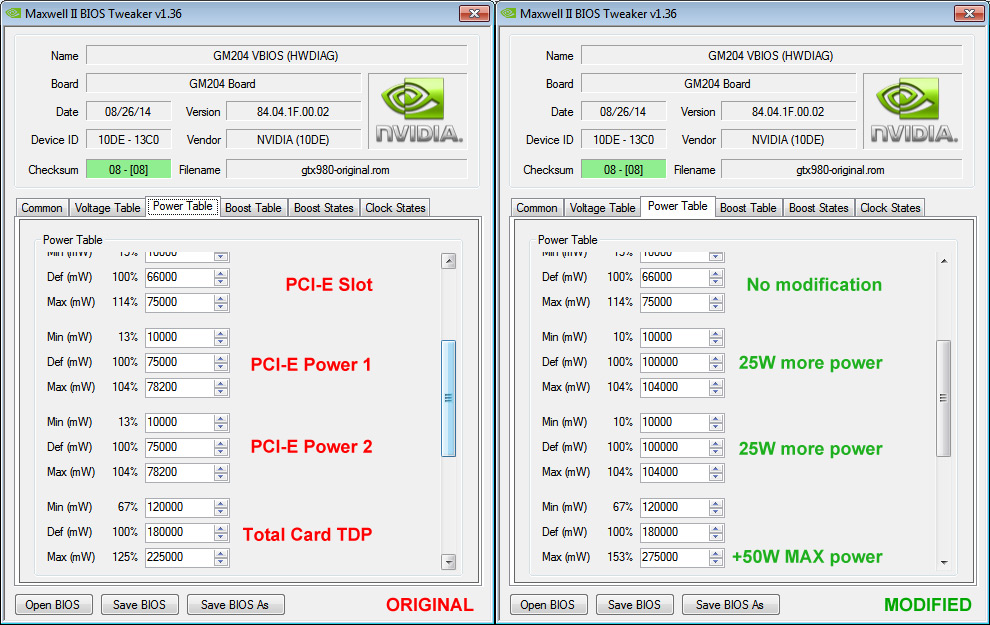 Информация от участника темы: Аффторитет Приведу пример как разгонять карты 970/980/980ti по таблице буст частот. Не буду писать как бекапить/сохранять биос, как и какие ставить поверлимиты - все это есть в шапке темы в инструкции по разгону. Образцом к материалу будет моя MSI GTX970 gamming 100ME. Поиграл я с разгоном в Afterburner-e и решил зашить разгон в биос. Задача разогнать карту бустом до 1506МГц при напруге в 1.231в. Начинаем.