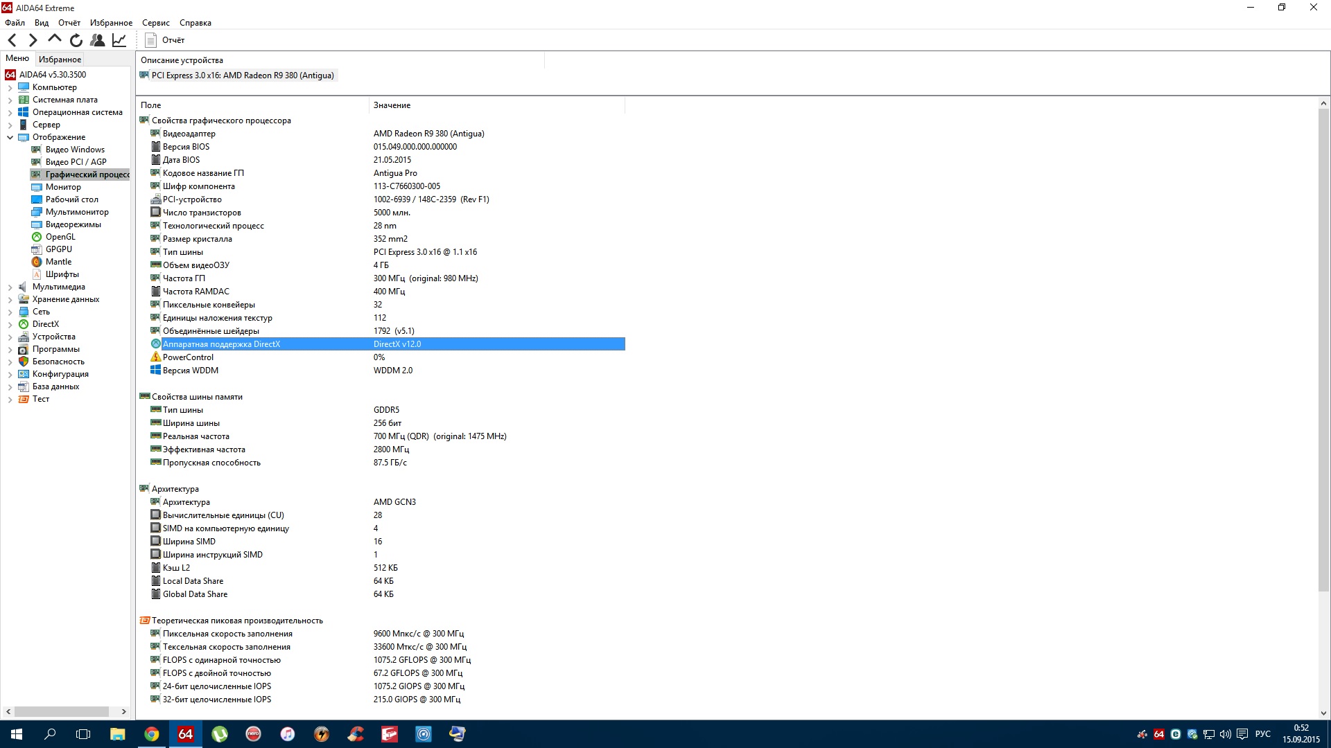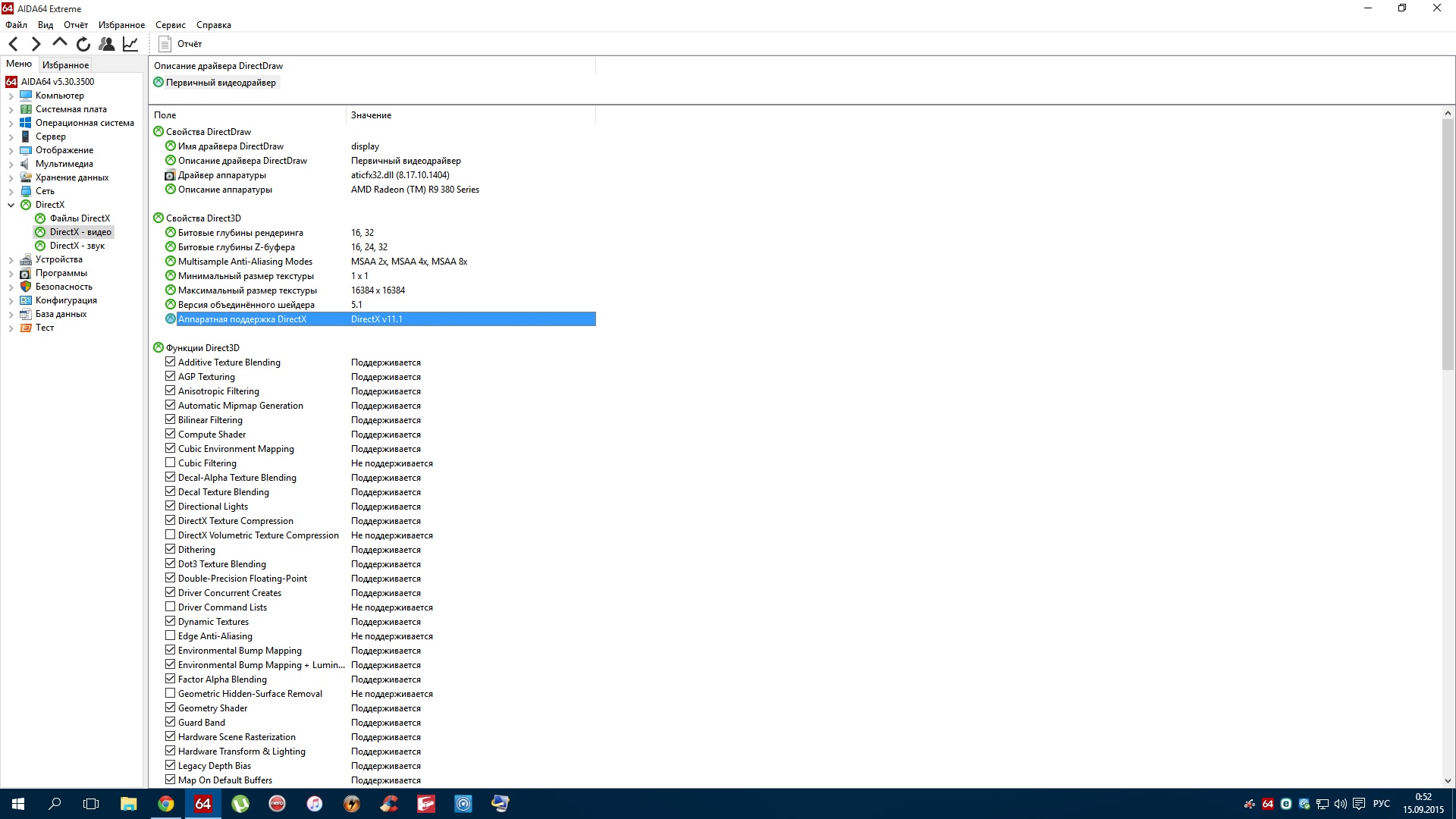 Всем доброго времени суток.. Господа.. проблема такая.. имею R9 380.. в отображении DX во всяких информационных прогах.. Аида.. GPU_Z и т д.. версия DX написана 11.1.. хотя карта держит 12.. винда 10 так же.. 12.. почему так?.. в инете видел скрины из CPU_Z там написано 11.2 на аналогичной карте.... проги самые новые версии.. дрова тоже стоит последний Каталист.. 15.7.1.. ставил 15.8 бету.. ничего не поменялось..