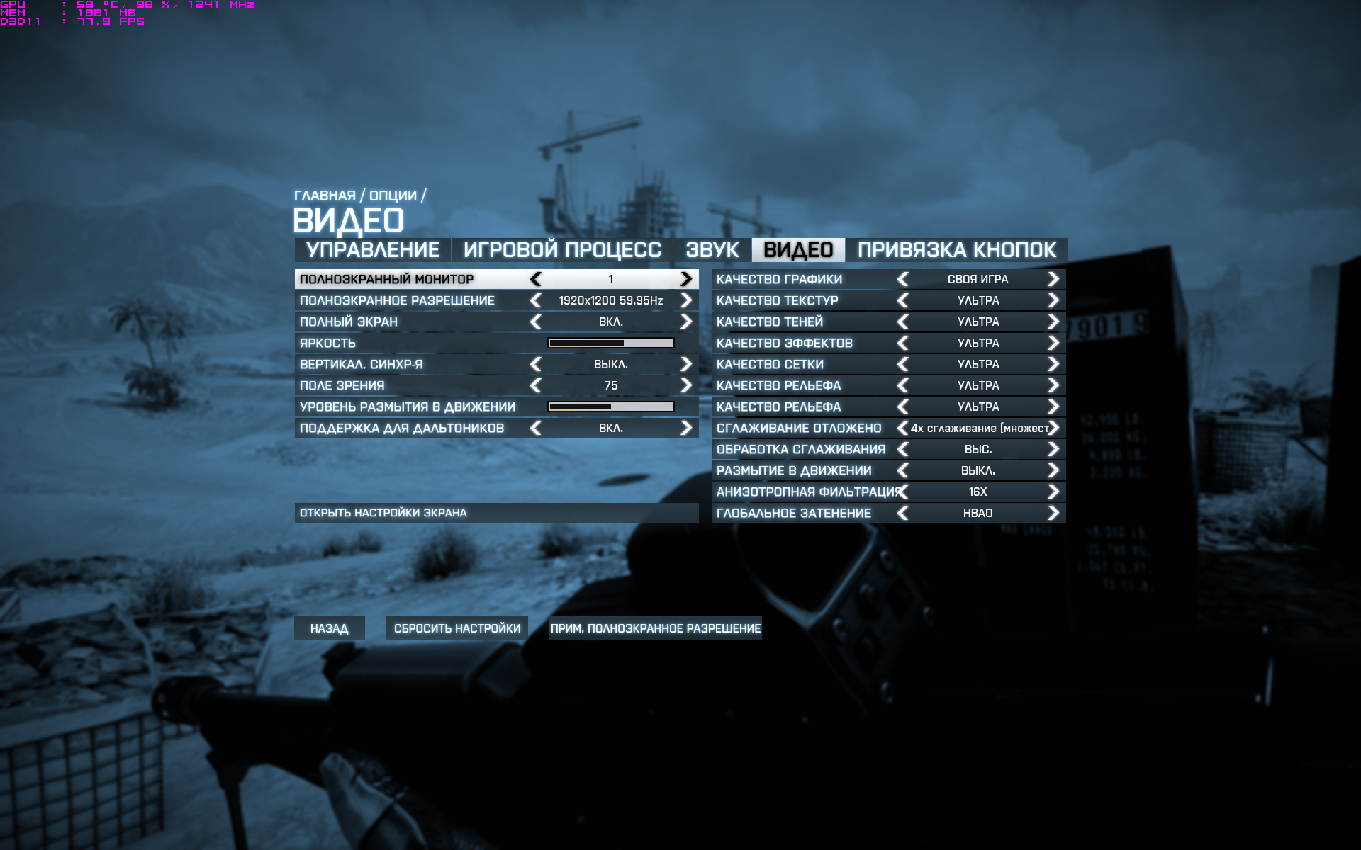h1jacker666 #77 вот при такой позиции все на ультра 1080р на профильном разгоне 49фпс сейчас показывает. Да ещё, заметил глюк что сразу после загрузки фпс больше, нужно покрутить HBAO на SSAO и обратно,тогда становится каким и должен быть. Скидывал мать на штатные значения, в этом месте фпс так же 49. что у вас? upd. на пустом неранговом сервере.