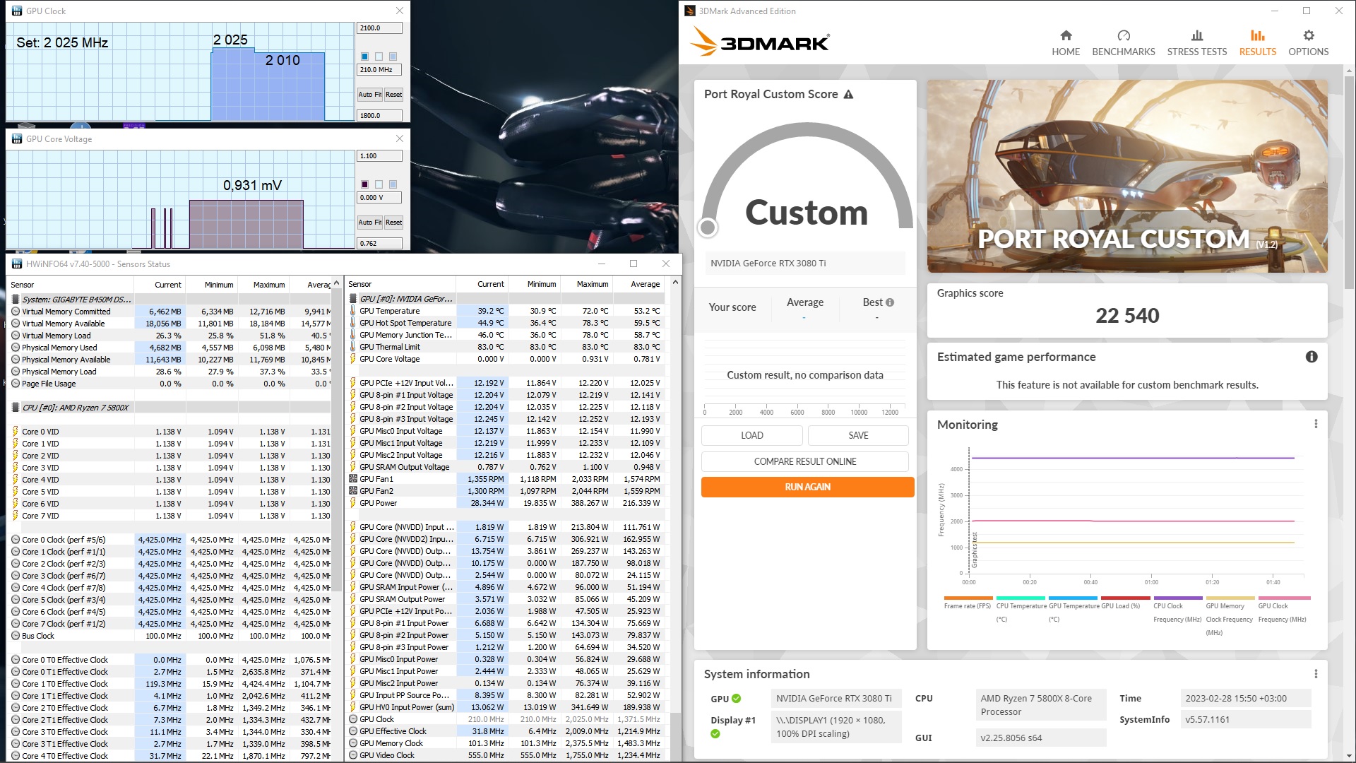 На моих (пока тестовых) настройках (931mV@2025MHz) во время прогона Port Royal частота сначала держится 2 025 MHz, затем опускается до 2 010 МГц (эффективная при этом в HWiNFO64 - 2 009 МГц). Не уверен что с такими настройками пройдёт тест стабильности в 3DMark (не пробовал ещё), но хотелось бы понять как стабилизировать частоту (снижать\повышать напряжение)? Переход с изначально выбранных 981mV уже избавил от срабатывания лимитов Pwr\VRel\VOp. Хотя тестирование и ведётся на OC VBIOS с добавлением 13% (т.е. увеличение до максимальных 450W).