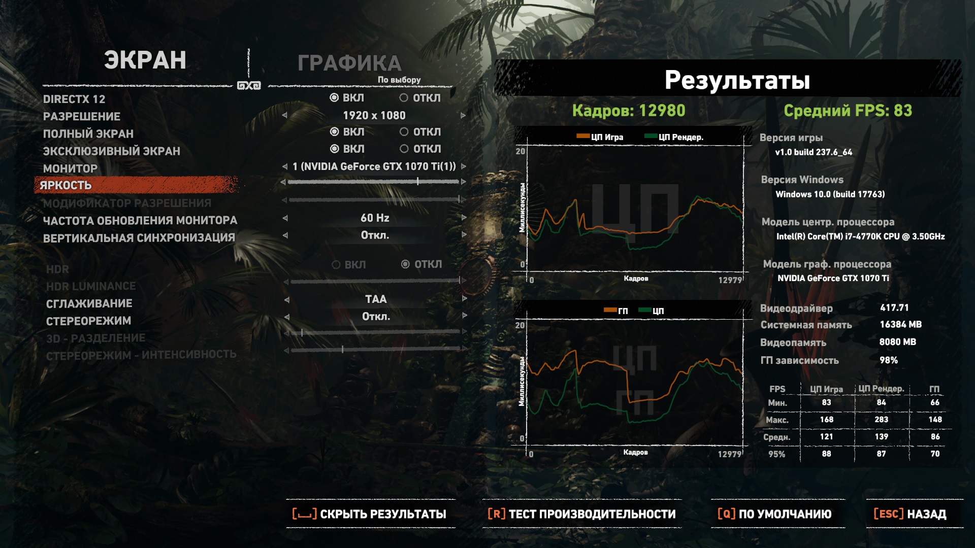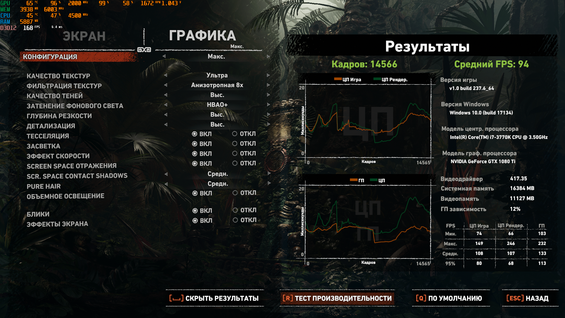 Настройки как у вас, я смотрел ролики именно в тех местах где у меня низкий fps, меня интересуют именно эти места. Так как если играть, один из первых уровней в городе, где фонтан, fps соответсвею бенчмарку, и у меня просадки до 28 fps.
