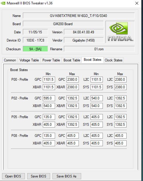 Информация от участника темы: Аффторитет Приведу пример как разгонять карты 970/980/980ti по таблице буст частот. Не буду писать как бекапить/сохранять биос, как и какие ставить поверлимиты - все это есть в шапке темы в инструкции по разгону. Образцом к материалу будет моя MSI GTX970 gamming 100ME. Поиграл я с разгоном в Afterburner-e и решил зашить разгон в биос. Задача разогнать карту бустом до 1506МГц при напруге в 1.231в. Начинаем.