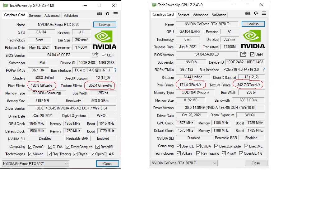 В смысле?? что взял 3070?? ну и нафига мне нужна 3070ti c её температурами памяти долбящимися в сотку, или чтобы выиграть 3-5 кадров, было бы у неё хотя бы памяти больше другое дело, а так овчинка выделки не стоит вот свою 3070 подразогнал производительность стала такой же как и у тишки а то и выше, да и продал я её удачно и 3070 взял тоже удачно, а гнать 3070ti ну это так себе сомнительная затея с её памятью которая и без разгона того гляди закипит, вот моя разогнанная 3070 и вот сток 3070 ti у кого больше пиксельная заполняемость и текстурная?? могу ещё накинуть разгон памяти только от этого ни текстурная не пиксельная заполняемость не увеличивается потому что ей и этой пропускной способности 256 битной шины хватает.