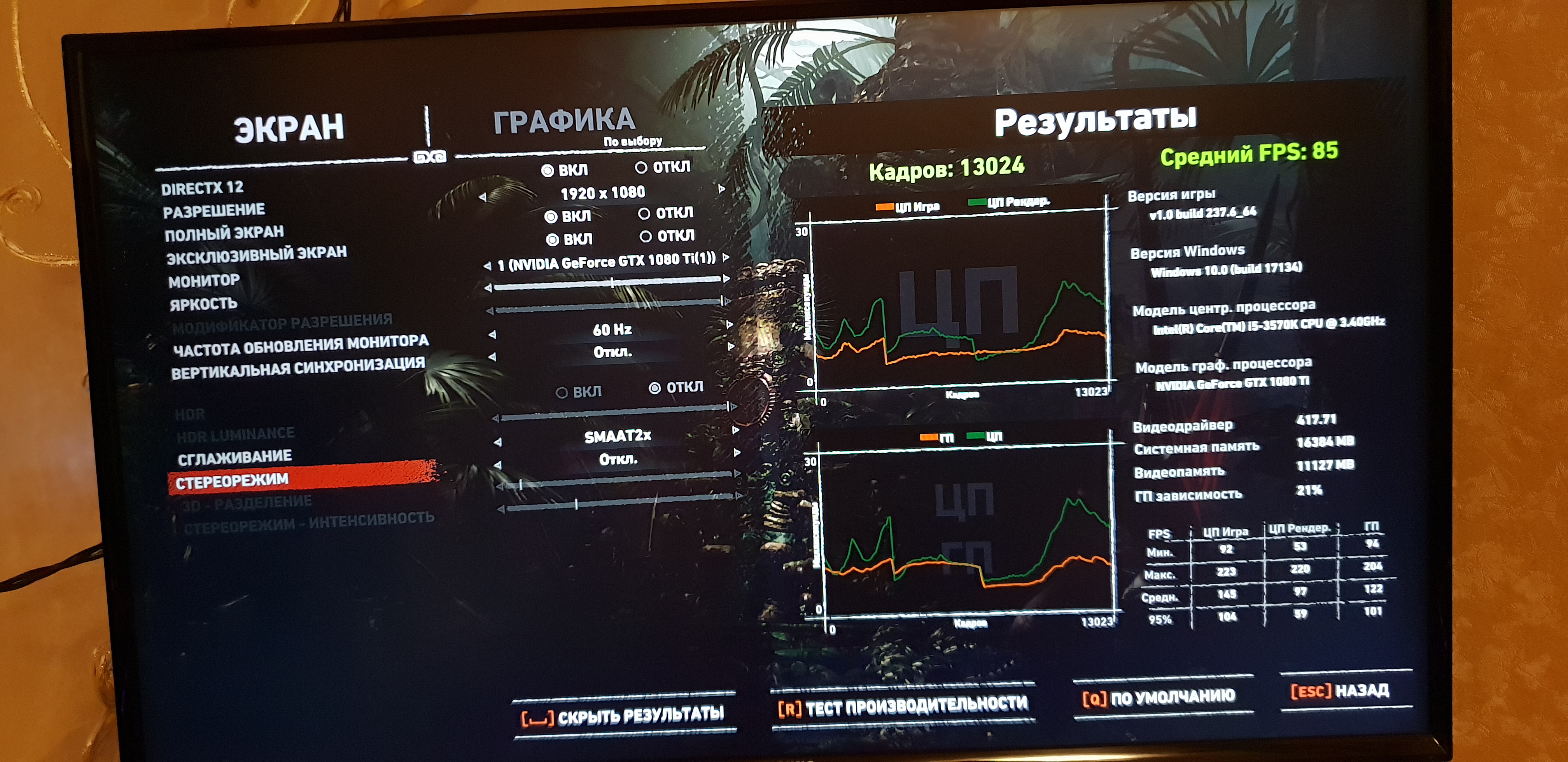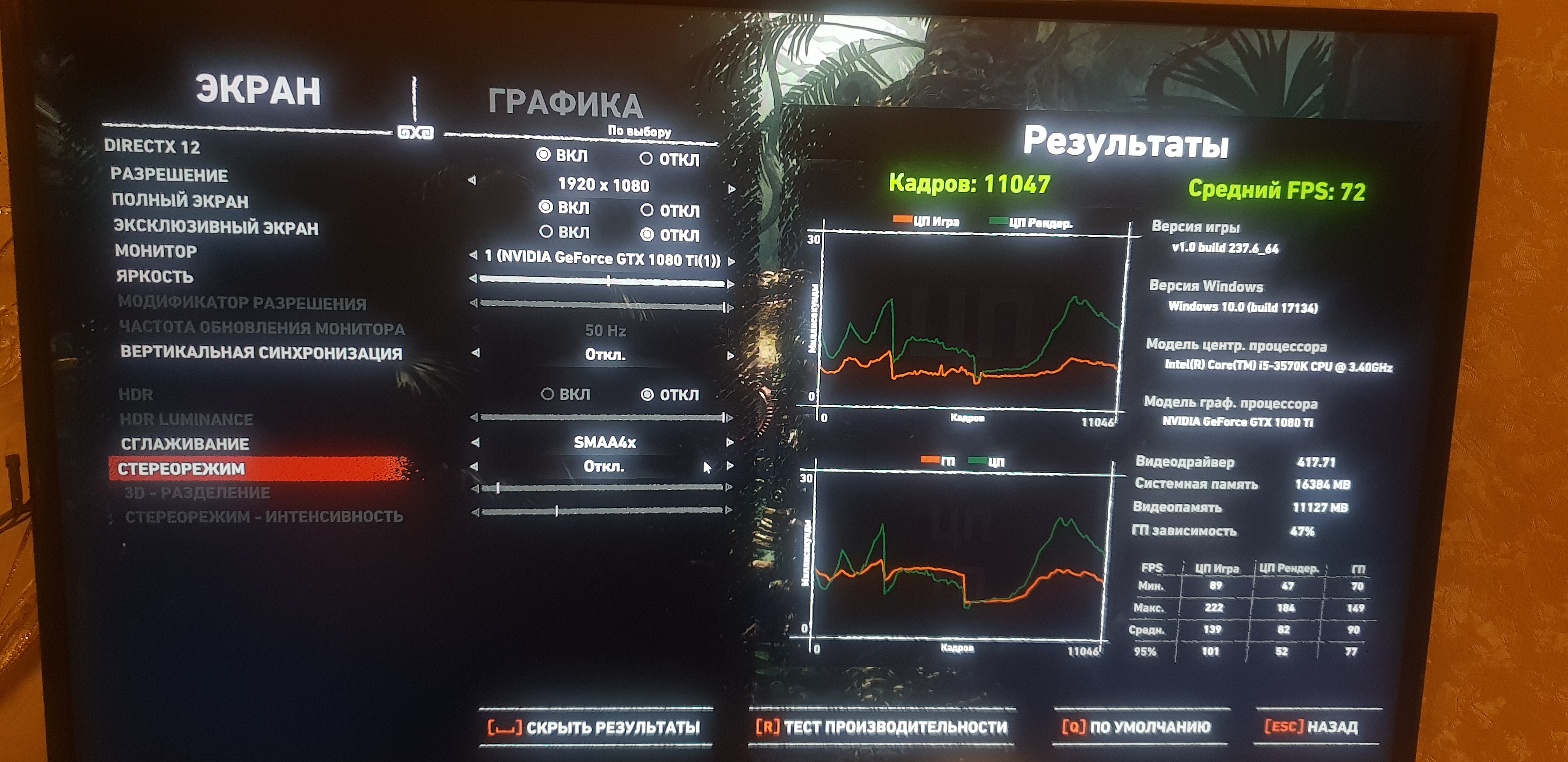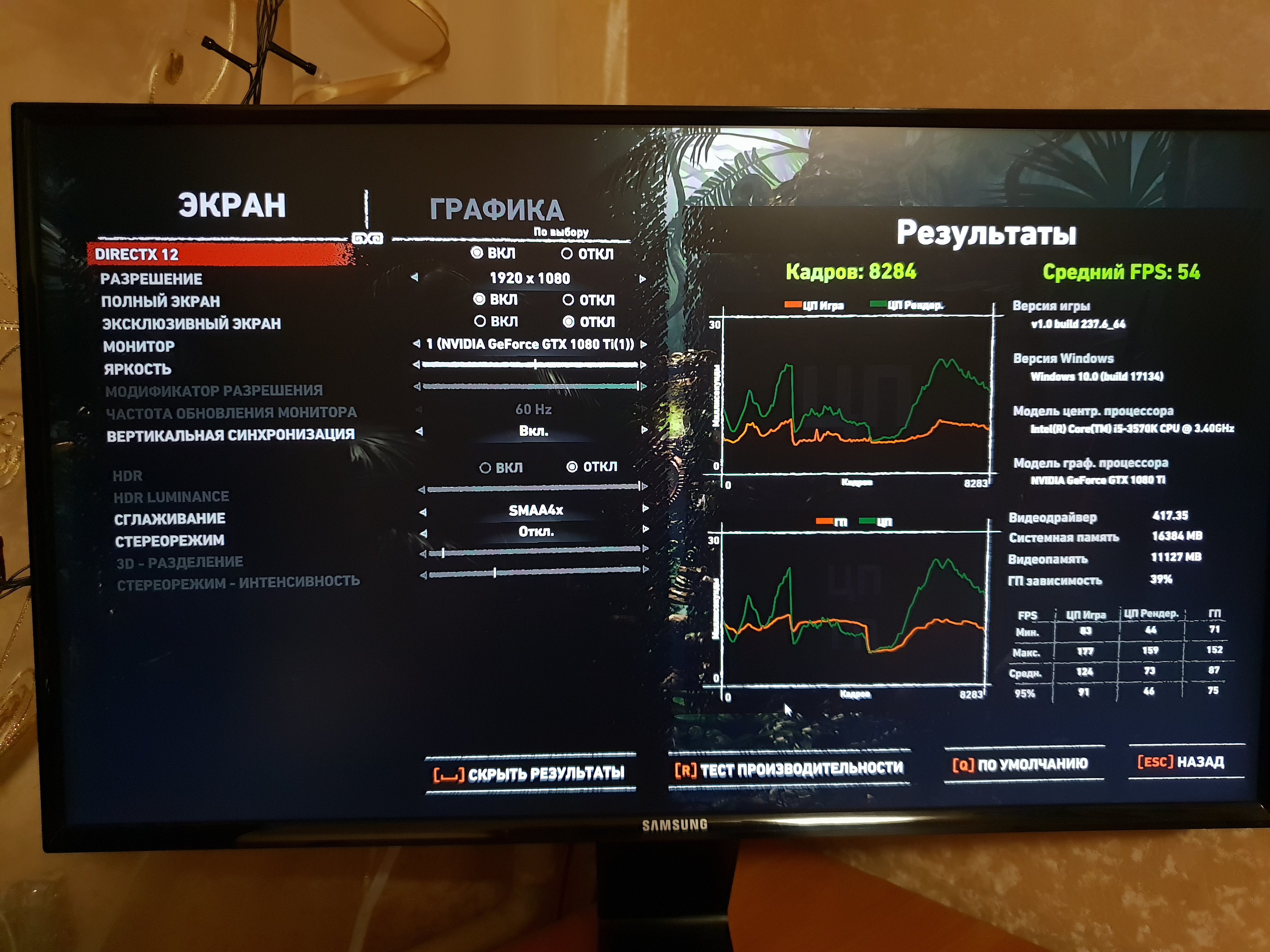 Всем привет. Читаю последние сообщения и скажу что есть правда в одном, процессор нужно минимум 8700к для 1080тi, еще лучше 9900к. Вот два скрина для примера в разнице фпс. Мой 3570к на 4.2 ггц и 5.0ггц. И еще пища для размышлений мой 5.0ггц и 1080тI и 9700к и 1080.