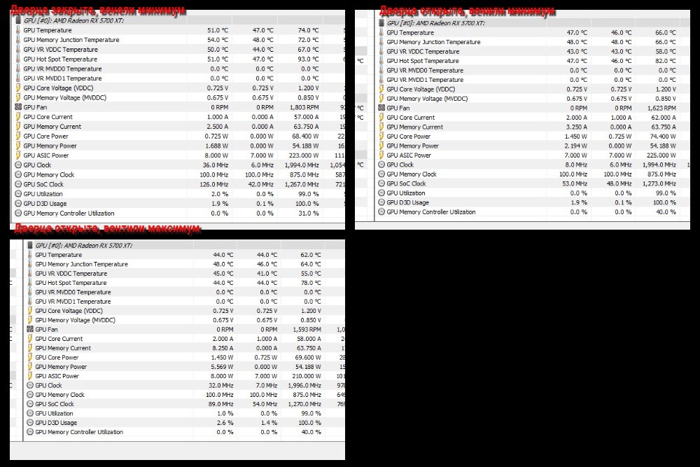 Так решил поиграл сегодня не много, заодно померить температуры с открытой, закрытой дверцей корпуса и вентиляторами подключенными к встроенному реобасу. Вертушки которые подключены к матери работают на 50%(800оборотов) до температуры 50 градусов( они так и работали на 800обротах все время)