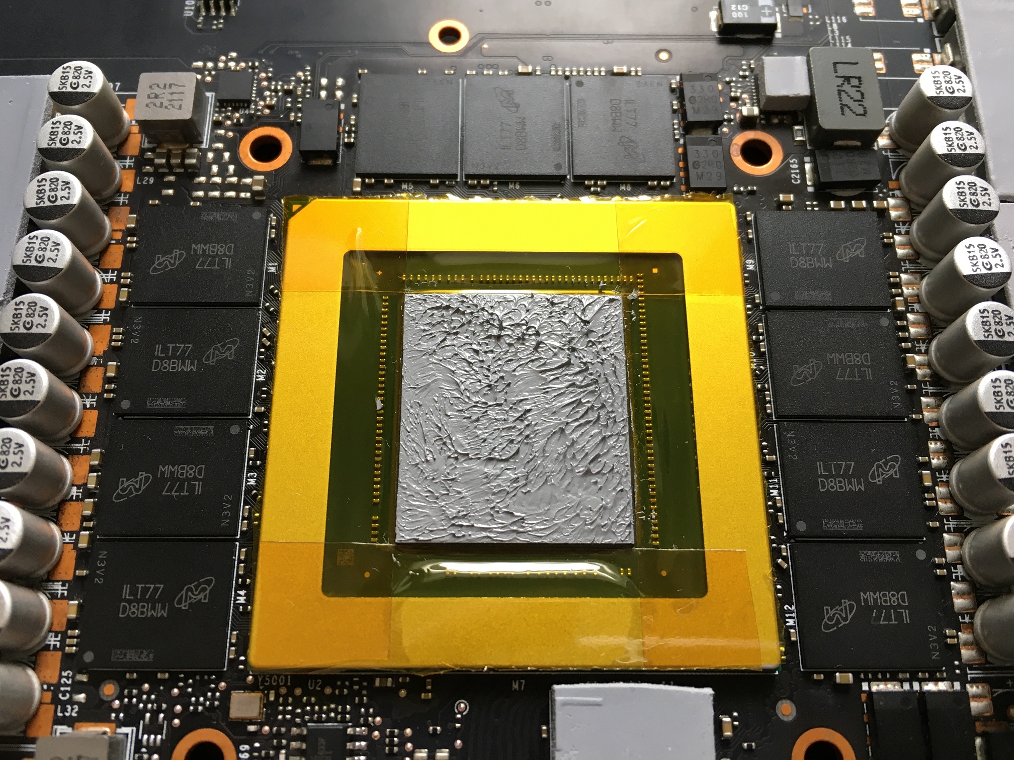 После разборки карты с Carbonaut я решил проверить имевшуюся у меня термопасту MX-4 от Arctic. Она конечно не первой свежести (была куплена 3 августа 2021 года, т.е. чуть более чем 2 года прошло), но сойдёт. Кроме этого, хочется дополнительно проверить теорию, что термопрокладки на памяти просто не дотягивались до чипов из-за толщины Carbonaut. Так что очищаем графический процессор и теплопроводную пластину на радиаторе и наносим тонким слоем термопасту на графический процессор. Снимать Kapton вокруг GPU я не стал (мало ли для чего ещё пригодится).