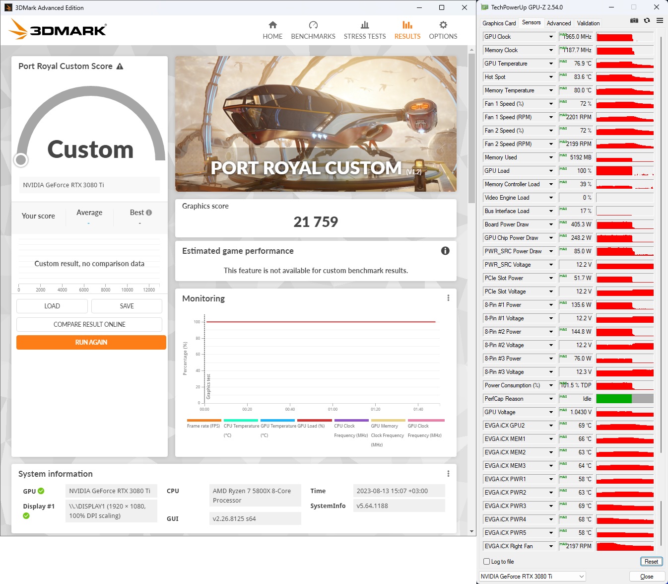 В Port Royal максимальная температура GPU достигла 76,9°C, а Hot Spot - 83,6°C (дельта составила 6,7°C). Память тем временем разогрелась до 80°C - неплохо! Это подтверждает, что с термопрокладками всё было в порядке, а разница 0,2 мм имеет огромное значение. Они действительно плохо контактировали с чипами памяти. Общее энергопотребление составило 405,3W.