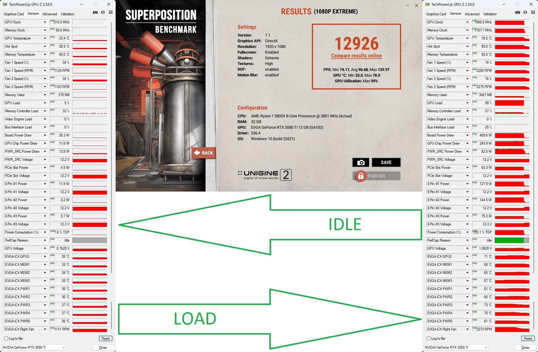 После прогона тестов интересно сравнить температуры Carbonaut с температурами MX-4. Правда удастся это сделать только в Superposition. Разница между ними на 450W не так уж и велика - 1,6°C по температуре GPU и 2°C по температуре Hot Spot. Вероятно старость термопасты сказывается на результатах, но пока я не представляю как достать не только высокопроизводительную, но и свежую термопасту. Я знаю что GELID изменила упаковку для своей GC-Extreme, но мне она пока не попадалась на глаза. KPx же вообще нужно заказывать специально, а учитывая сложности заказать из-за бугра, то я не уверен что это будет хоть сколько-нибудь доступно.
