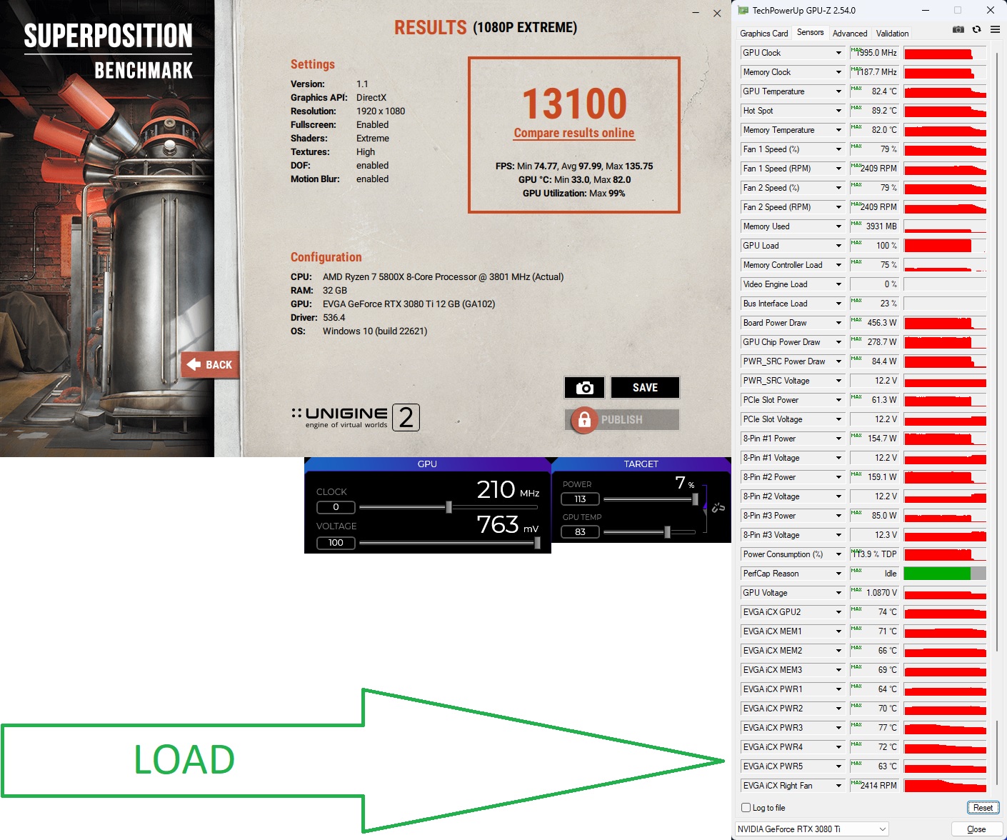 В Superposition нагрев был ещё чуть сильнее - 82,4°C для GPU и 89,2°C у Hot Spot (дельта равна 6,8°C). Температура памяти - без изменений. Общее энергопотребление увеличилось до 456,3W, однако максимальное напряжение составило 1,087V. При этом ни один из лимитов не сработал и Performance Cap Reason в GPU-Z был зелёный.