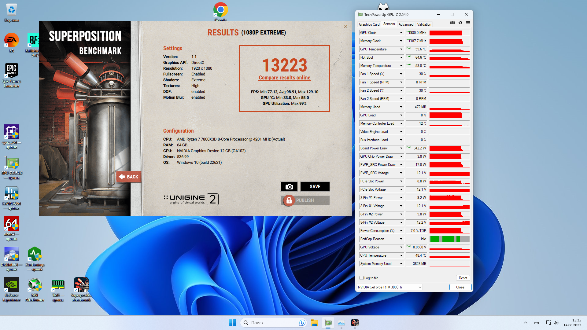 В Superposition GPU карты разогрелся чуть сильнее - 78,5°C на GPU и 85°C у Hot Spot (дельта равнялась 6,5°C). Память - без изменений. Общее энергопотребление составило 409,6W.