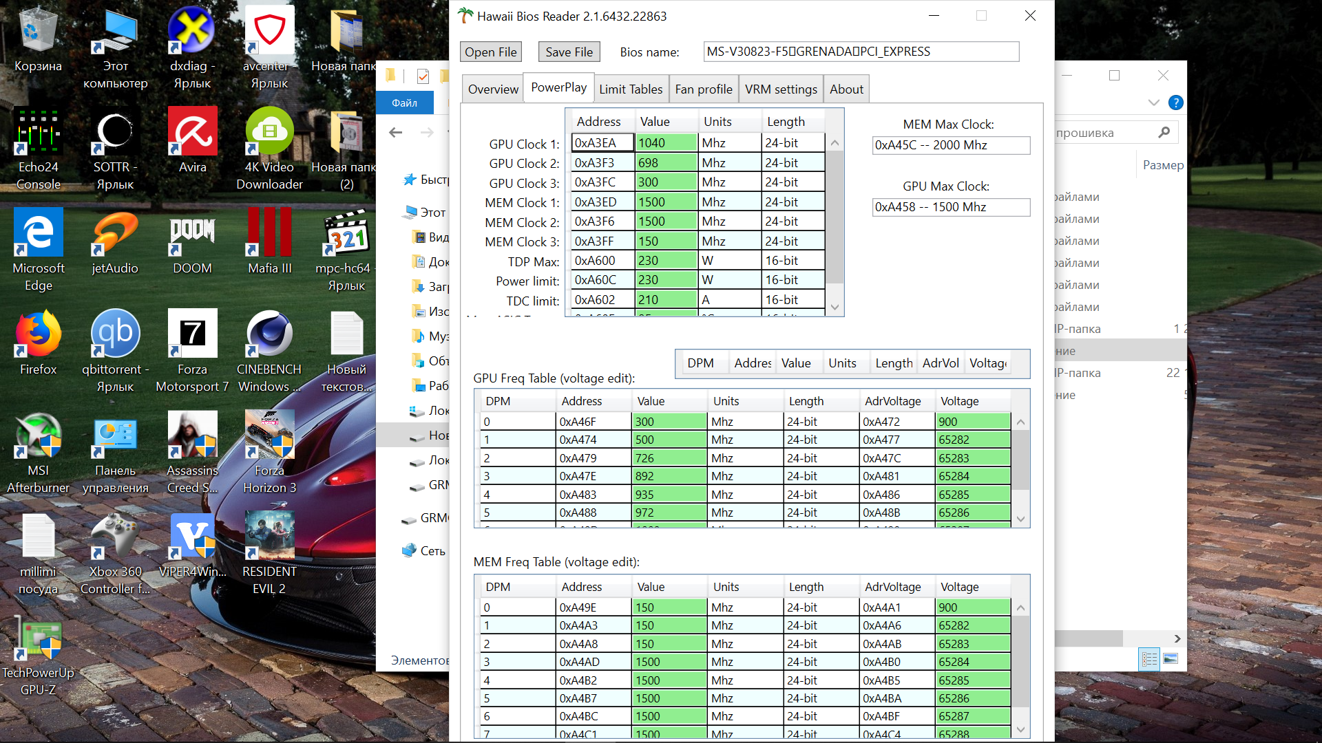 Добавлено спустя 1 час 14 минут 34 секунды: Есть ли вариант отредактировать частоты в 2д? т.е если опустить частоту с 1040 до 1010-1016 работает стабильно, просто ща думаю как поступить защить топорно в биос 1010 - это как бы самый топорный простой вариант, либо сделать как то по умнее что бы была занижена частота только в 2д, но через гаваи ридер я не вижу такой возможности, и ещё если занижаешь основную частоту, то и всё остальные меньшие значения тоже занижаются или же нет? Я просто пытаюсь понять за счет чего она начала нормально работать в следствии занижения основной частоты или же там все другие мелкие значения тоже уменьшились и поэтому и пашет теперь. Оригинальные биосы других производителей по частотам в основном далеко не все в 1040, т.е 1010 - укладывается в заводские значения других вендоров к примеру