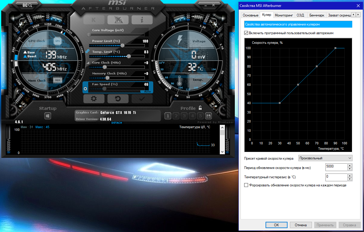 Без запущенного MSI Afterburner работает кривая из vBIOS, т.е. до определённой температуры вентиляторы вообще стоят. После запуска программы как на картинке. Запускаю прогу только перед играми, в остальное время она не нужна.