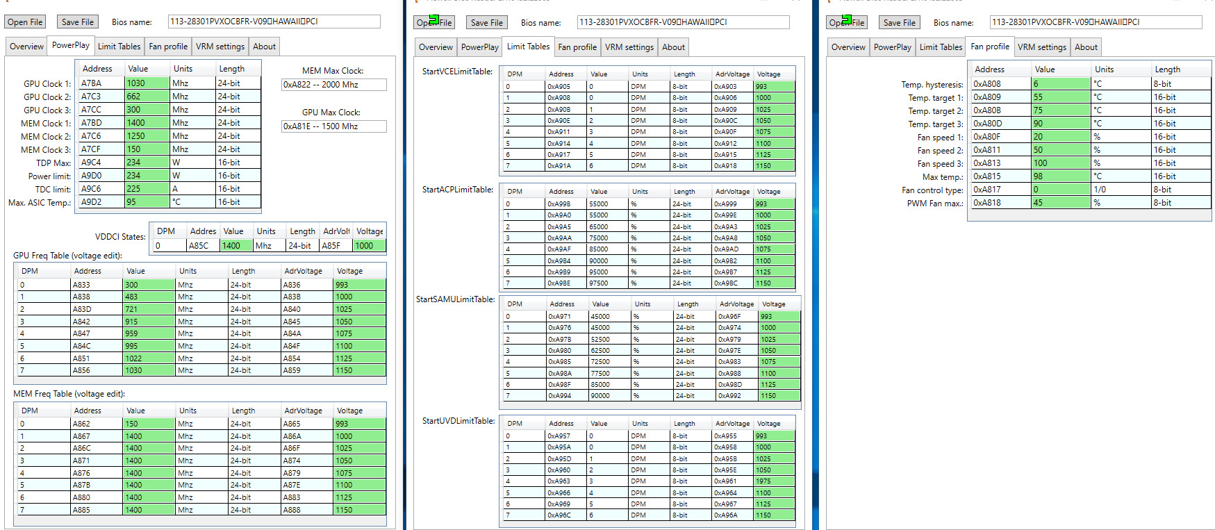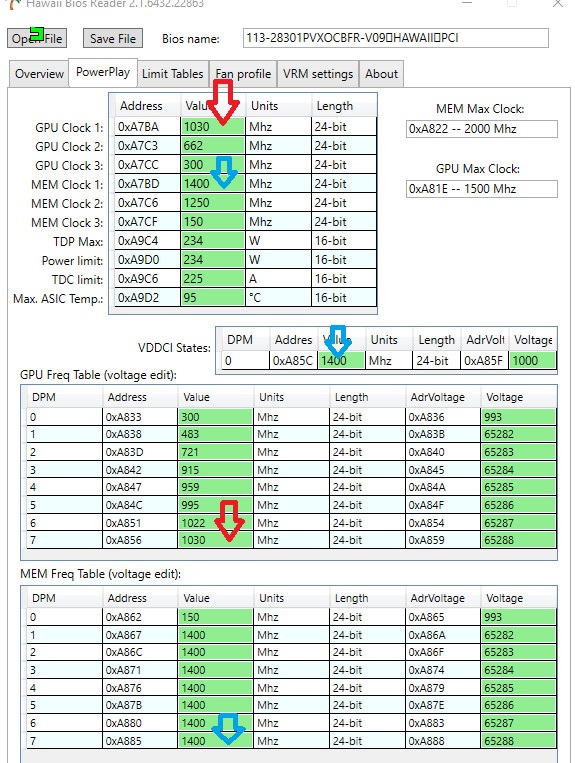 ок спасибо т.е если меняешь значения в верхней табличке то они должны соответствовать и нижней, я просто вернул ща 1040 проблема похоже в более низких частотах их надо было занизить,поэтому у меня она в бернере и работала хорошо с понижением основной частоты там идет занижение всех остальных как я понял, прошивка в 390x я так понимаю смысла большого не имеет кроме гула карты судя по тестам на ютубе?