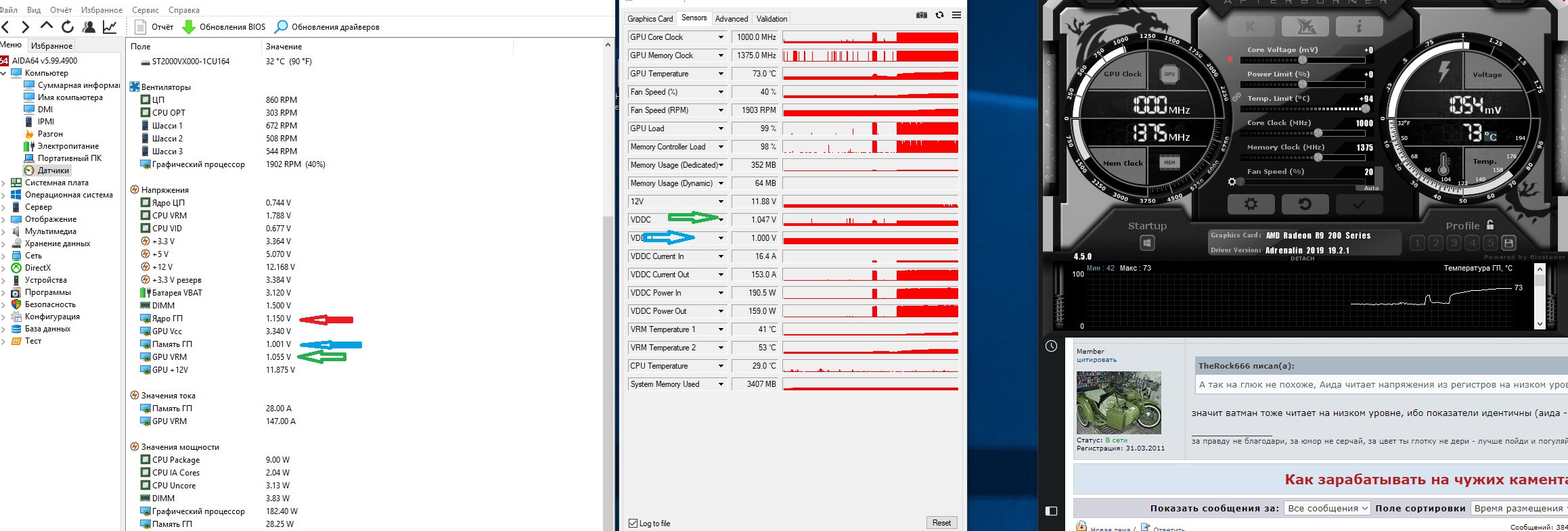кстати обрати внимание: во время нагрузки бубликом, датчики аида показывают практически то же самое что и GPU-Z (синяя, зеленая стрелки) возникает вопрос - что за напряжение (указал красной стрелкой)