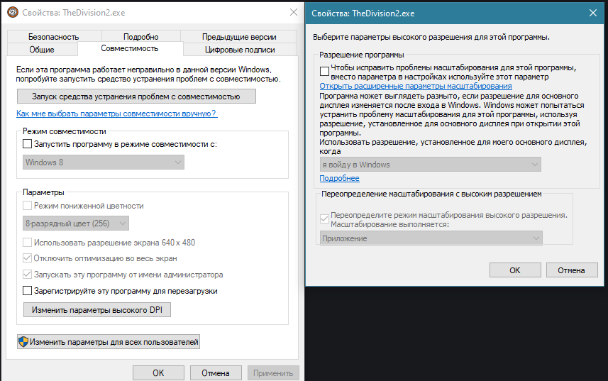 npa4ka Зарегился таки на форуме данном. Давненько не сидел на таких, всё ТГ, да ВК сообщества. Посмотрел я журнал ошибок, ничего там не нашел такого. Вылеты The Division 2 каждые полчаса в открытом мире, в миссиях реже, температуры железа мониторил, 65-70 градусов ЦП и видяха, охлад (куллера) работают не на максимуме. Год назад был аналогичный случай, именно с крашем дров видюхи. Вообще, у The Division 2 проблема с вылетами очень давно, об этом знает наверно каждый, кто играет в The Division 2, одних только рускоязычных гайдов на YouTube полно, о том, как убрать вылеты, что там только не придумывают, и на EasyAntiCheat игровой валят, и на фоновые службы (MSI AfterBurner и пр) и на неправильные тайминги и\или частоты ОЗУ. Вылеты как были, так и остались. Так же в игре не всегда корректно работает HDR (изучал эту проблему в сети, нашел англоязычные жалобы и попытки разобраться). В общем, вчера увеличил файл подкачки с 8 до 16 GB, поставил голку "запуск от имени администратора" и "отключить оптимизацию во весь экран". Так же, Изменить параметры DPI>Переопределите режим масштабирования с высоким разрешением(включить пункт)>масштабирование выполняется: приложение (выбрать приложение). На YouTube нашел один из вариантов решения проблем с вылетами.