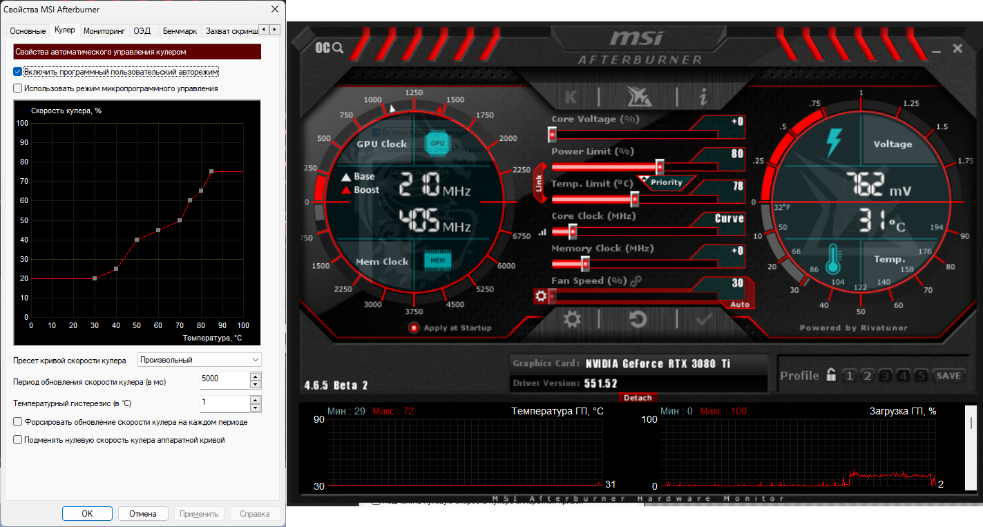 81 потому что я выключил обдув. Иначе когда темпа переходит 50гр они включатся-выключаются что в моих тихих рабочих условиях слышно и напрягает (собственно так и заметил проблему). 81 это редкость, чтото его подгрузило, обычно 60-70гр без обдува. Ты задал 30% на постоянку? или можно настроить кривую обдува? я чтото не нашел